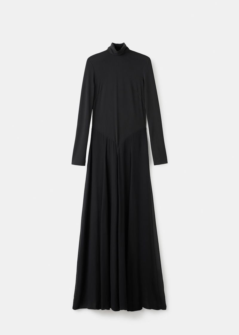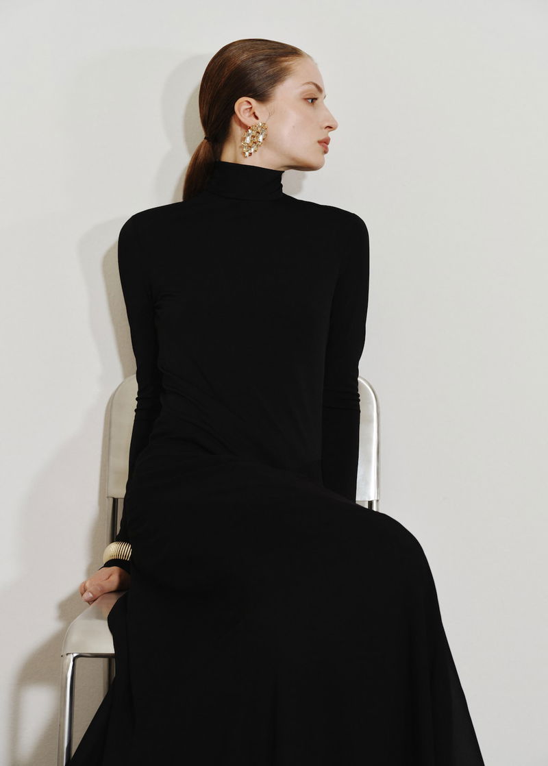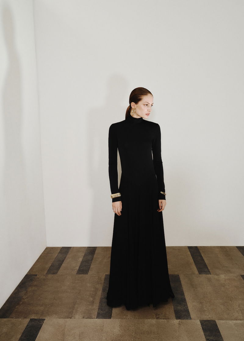Long design. A-line design. High neck. Long sleeve. V-cut at the waist. No Fastening. Inner lining. This garment is part of our party and event collection, designed to elevate your looks for special occasions.