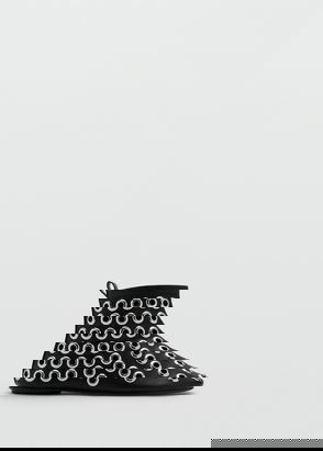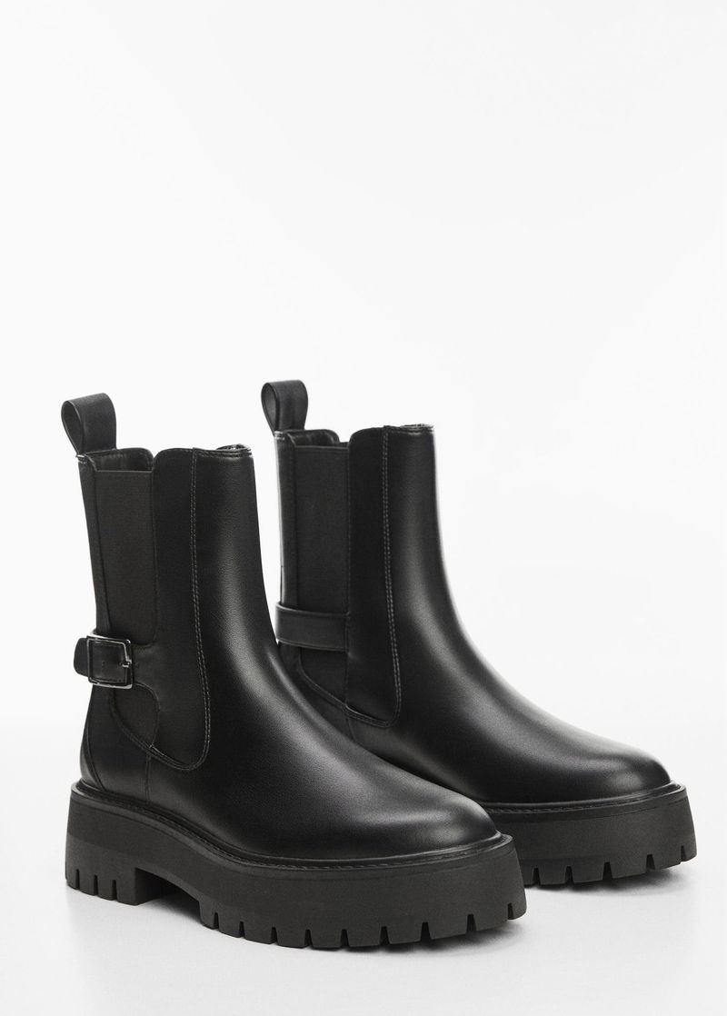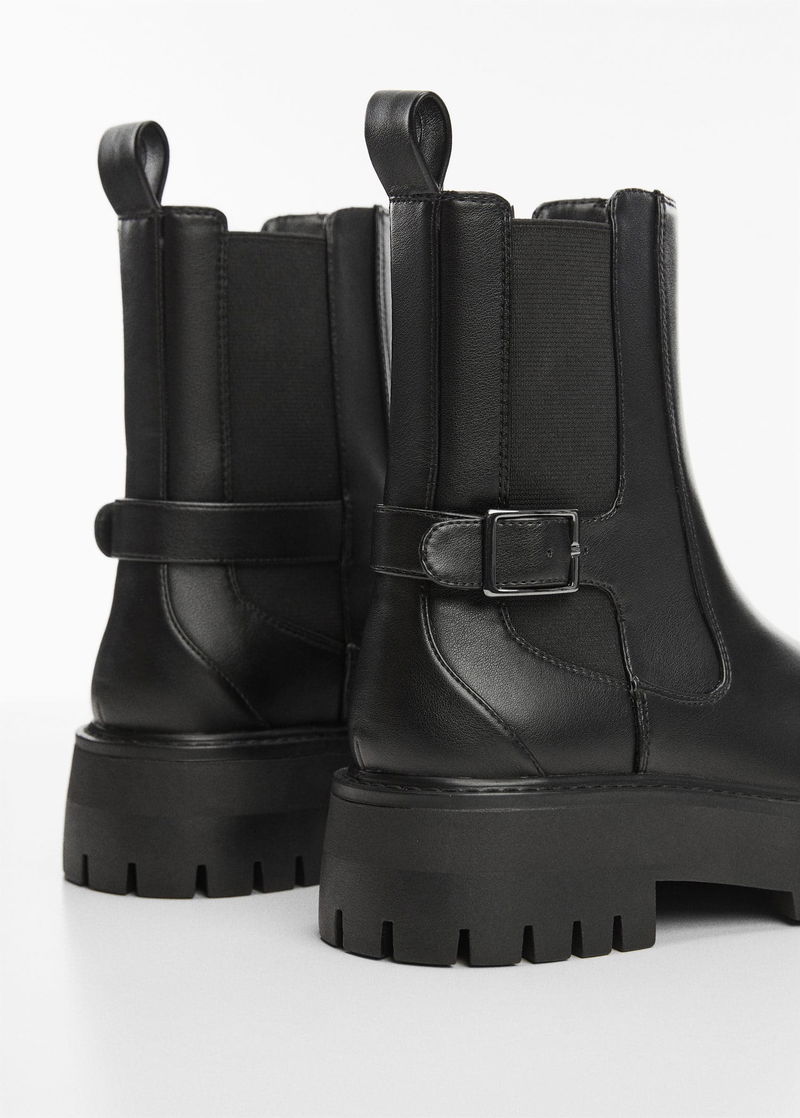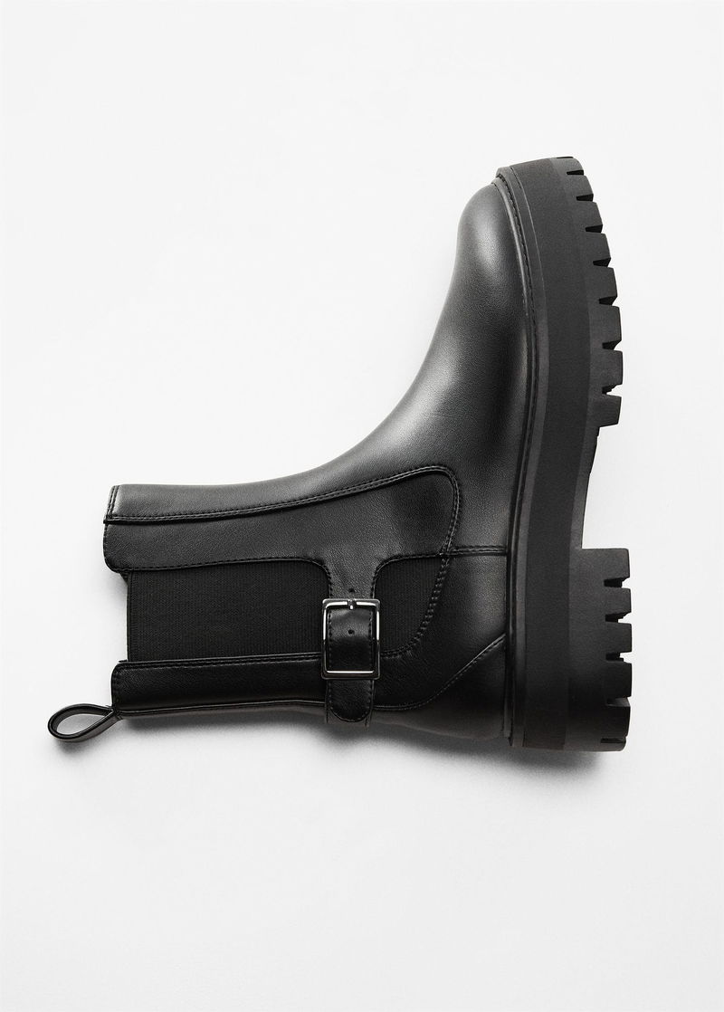 Faux leather, Rounded toe, Flat, Unclosed, Elastic side panels, Decorative buckle, Inner lining.