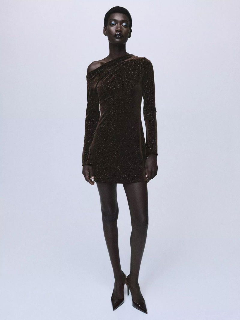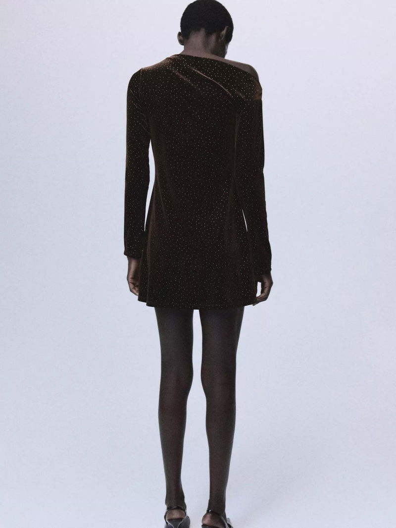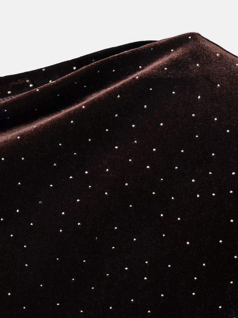 Asymmetric Neck Velvet Sparkle Mini Dress, Brown