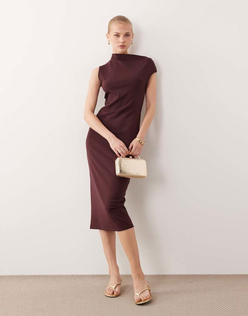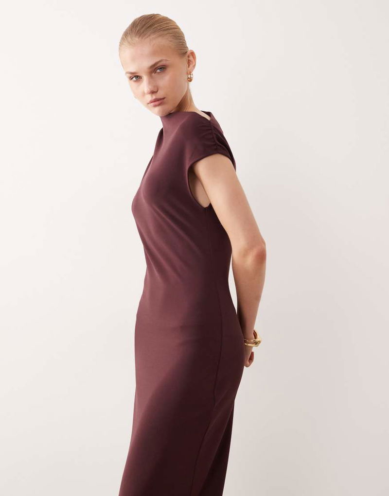 Asymmetric Short Sleeve Midi Dress In Deep Red