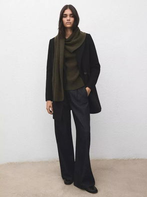 Fabric with wool, Ruched neck, Button closing on the neck, Midi fit, Wide lapels, Long sleeve, Adjustable belt, Asymmetric fastening, Inner lining.