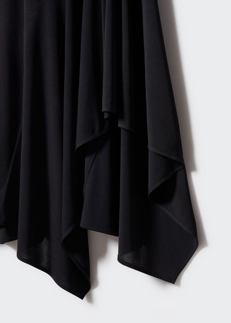Flowy fabric, Evasé design, Midi design, Frill detail, Asymmetric hem.