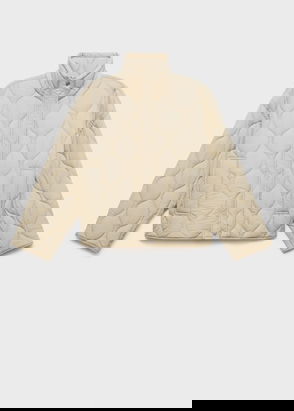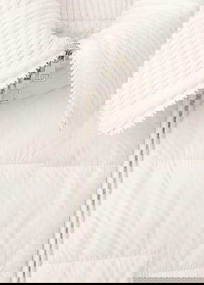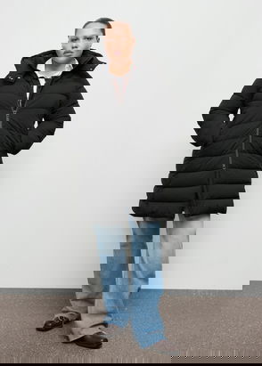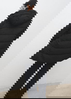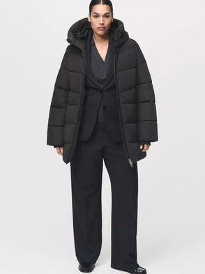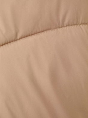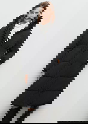 Long design, Quilted design, Down filling, Funnel neck, Long sleeve, Dropped shoulder seams, Side pockets, Removable belt, Press stud fastening on the front.
