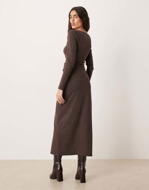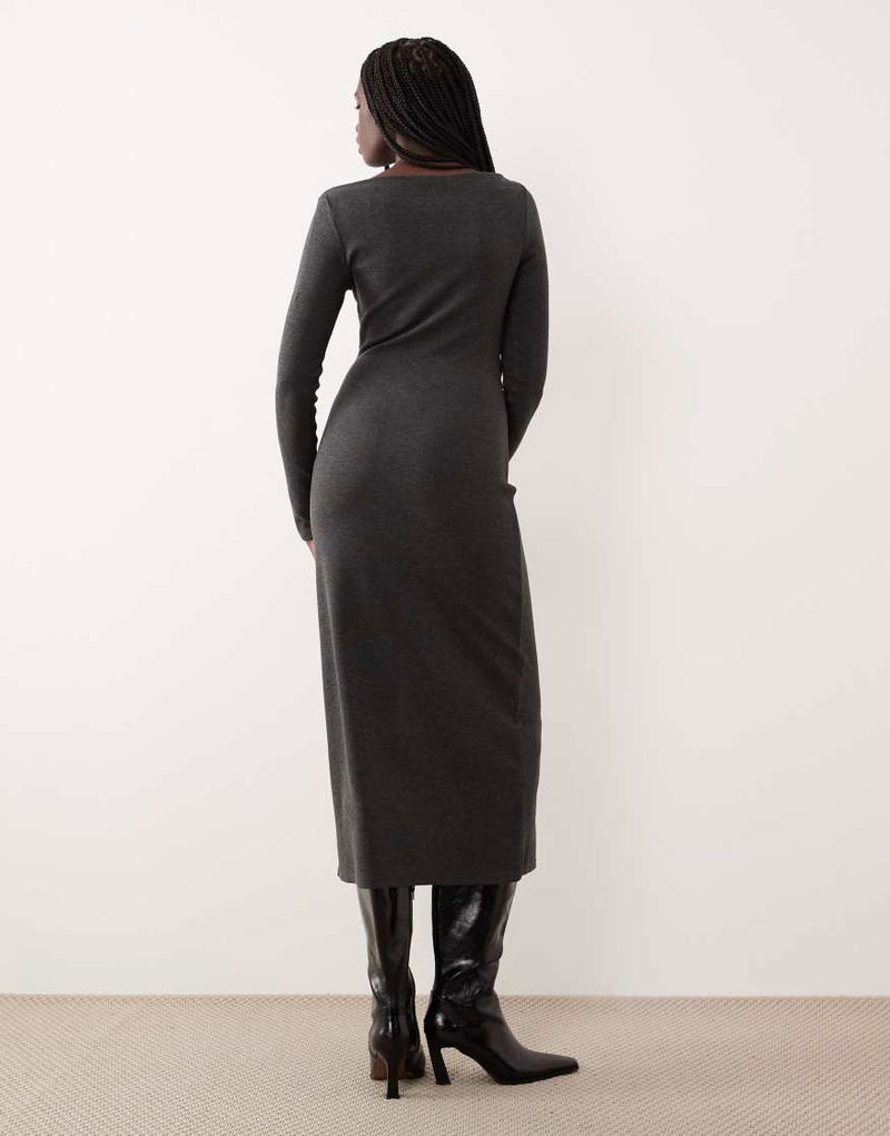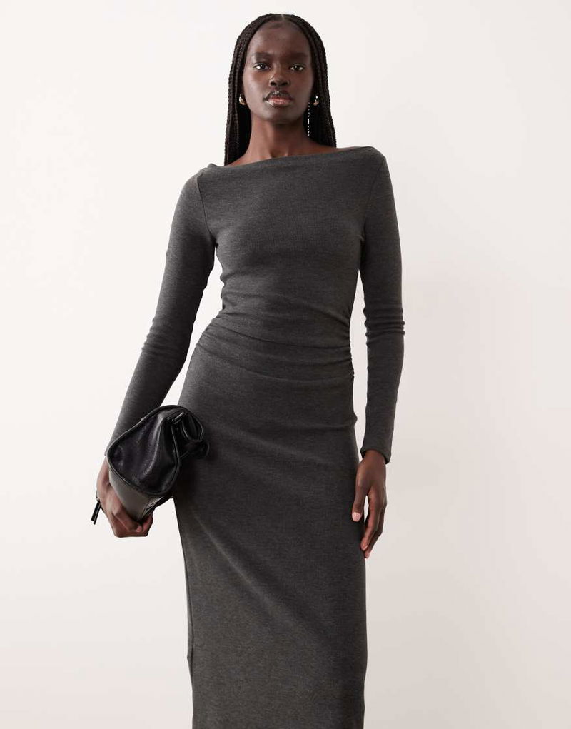 Boat Neck Ruched Waist Long Sleeve Maxi Dress In Grey