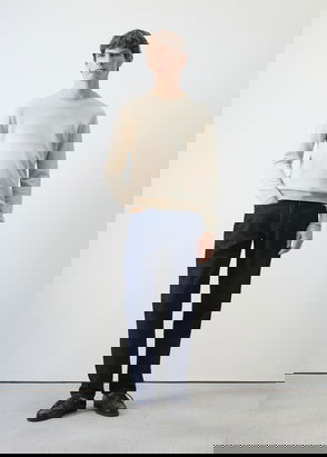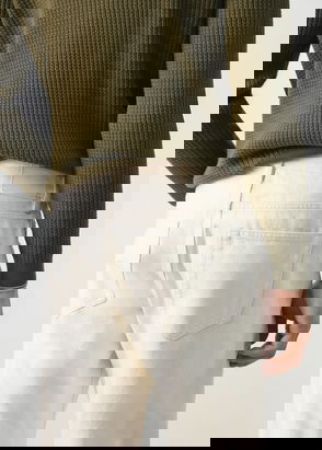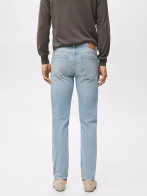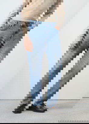 Product on sale. Regular fit. Denim-style cotton fabric. Medium faded wash. Zip and button fastening. Belt loops. Two side pockets. Coin pocket. Two patch pockets at the back.