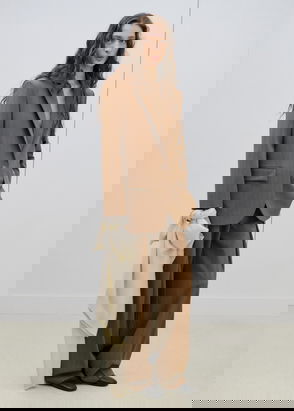 Unstructured design, Textured fabric, Lapel-collar, Long sleeve, Two side patch pockets, Button fastening on the front, Bow on the waist
