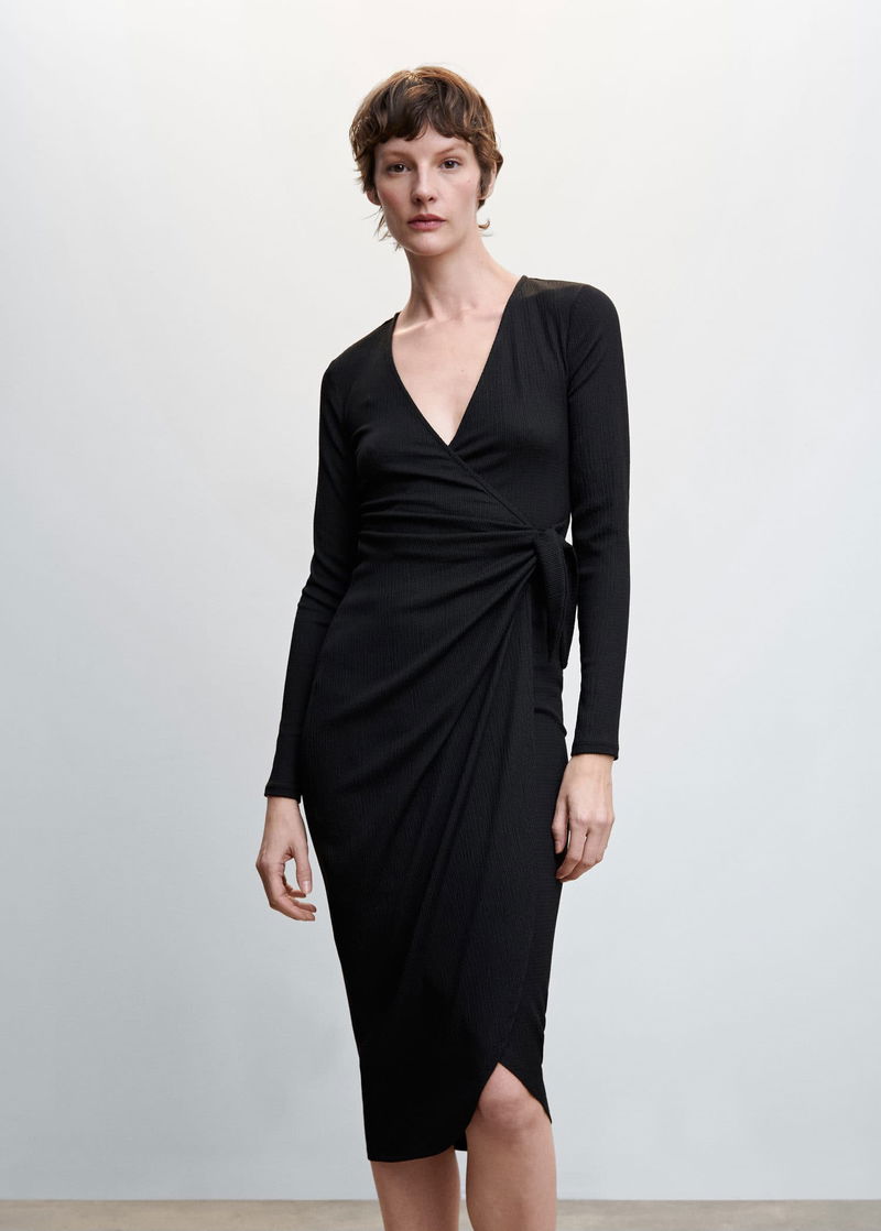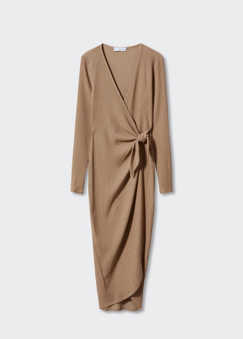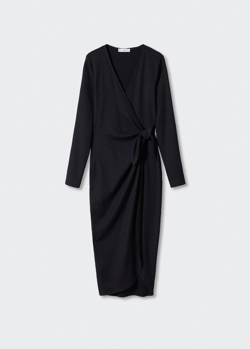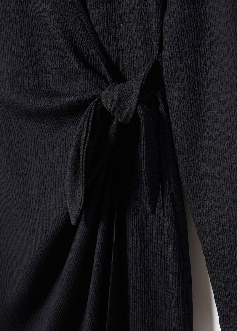 Textured fabric, Straight design, Crossover design, Midi design, Wrap collar, Long sleeve, Side bow fastening.