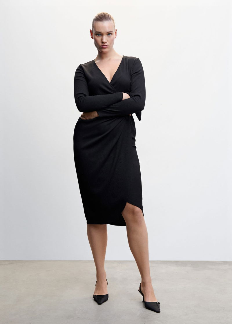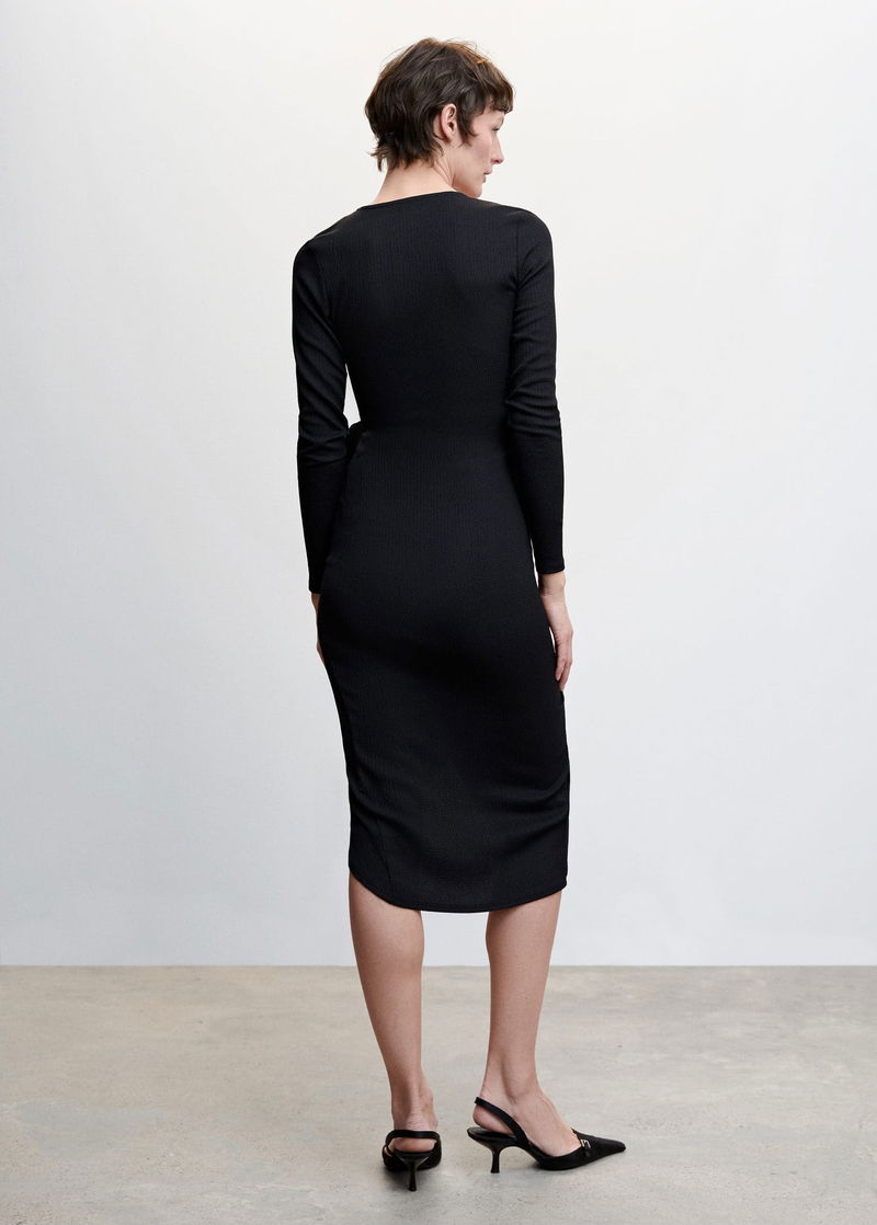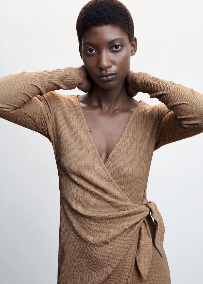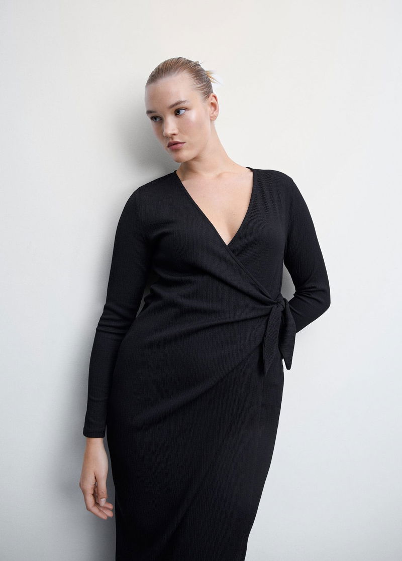 Textured fabric, Straight design, Crossover design, Midi design, Wrap collar, Long sleeve, Side bow fastening.