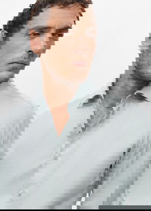 Relaxed fit, Made of lyocell and linen providing great fluidity and movement, Bowling collar, Short sleeve, Button up, Side slit hem, The model is 187 cm tall and is wearing a size M.