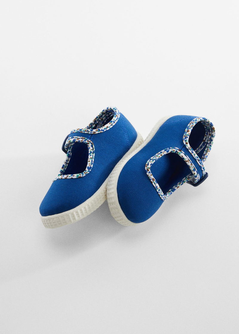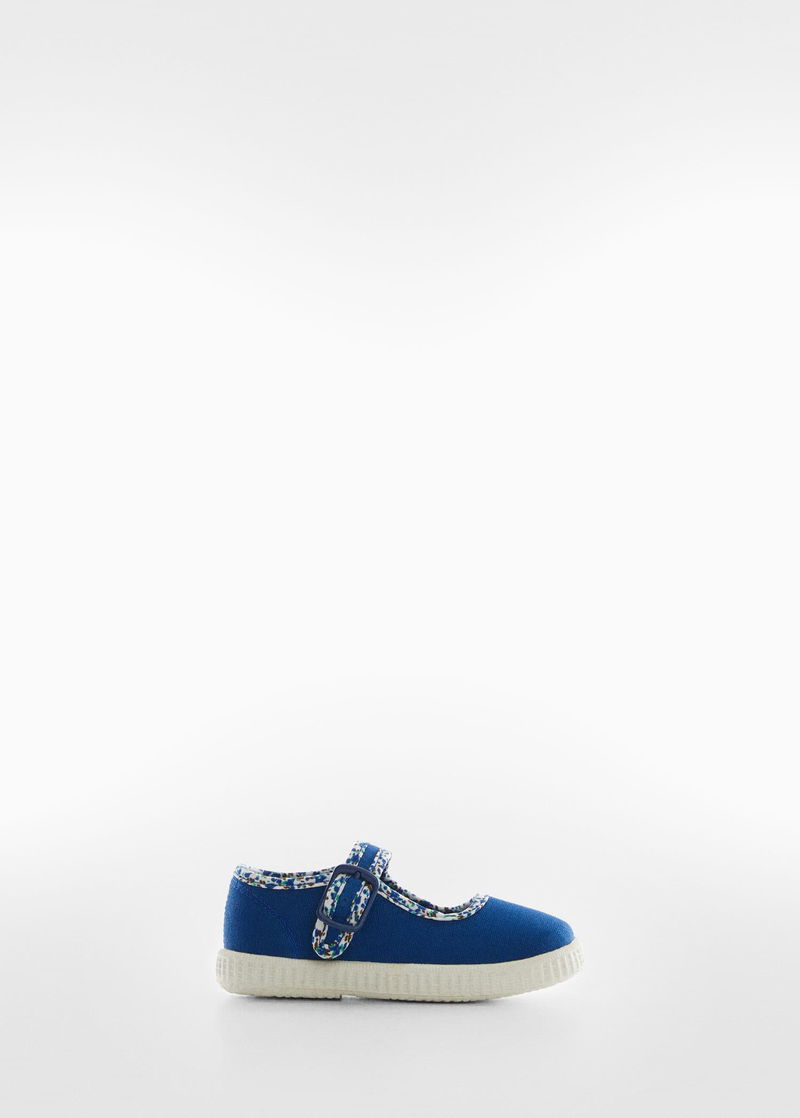 Flat, Rounded toe, Contrasting trim, Print, Buckle.