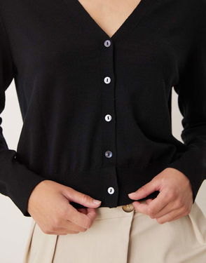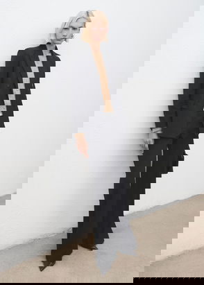 Fine knit fabric, Long sleeve with buttoned cuffs, Two-buttoned flap chest pockets, Button fastening on the front section, Dropped shoulder seams, Classic collar, Oversize design, Straight design.