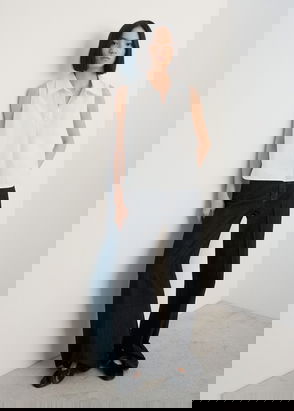 Cotton fabric, Mao neckline, Short sleeve with turnover, Elastic side panels, Button fastening on the front section.