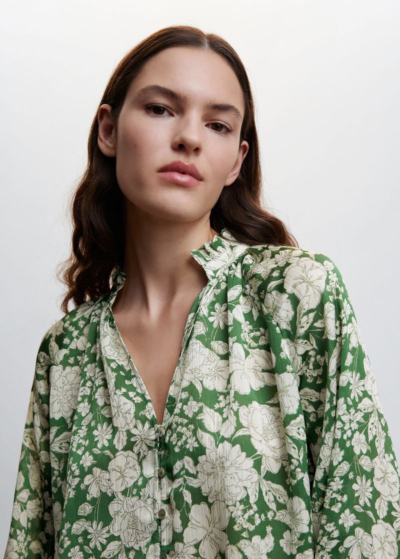 Flowy fabric, Satin, Oversize design, Flowers print, Shirt-style V-neck collar, Long sleeve with buttoned cuffs, Button fastening on the front section.