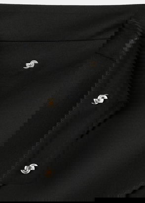 Elastic, Mini design, Tailored design, Straight design, High waist, Two side pockets, Decorative button detail.