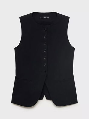 Lapel with notch, V-neck, Midi fit, Two side welt pockets, Sleeveless, Button up, Inner lining.