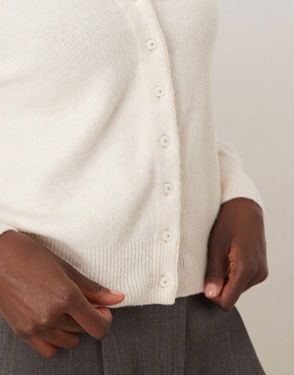Oversize design, Medium knit, Two side patch pockets, Cable knit, Button fastening on the front section, V-neck, Long design.