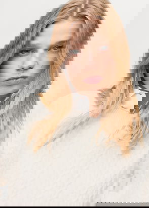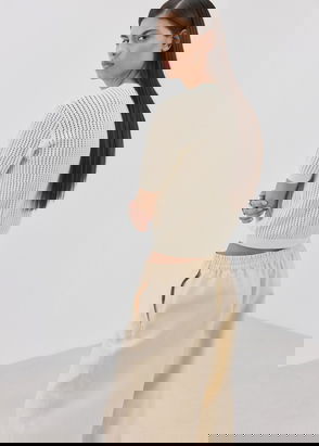 Long sleeve, Contrasting knit, Cable stitch, Straight design, Cable knit finish, Rounded neck, Embossed flowers, Thick knitted fabric.