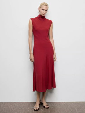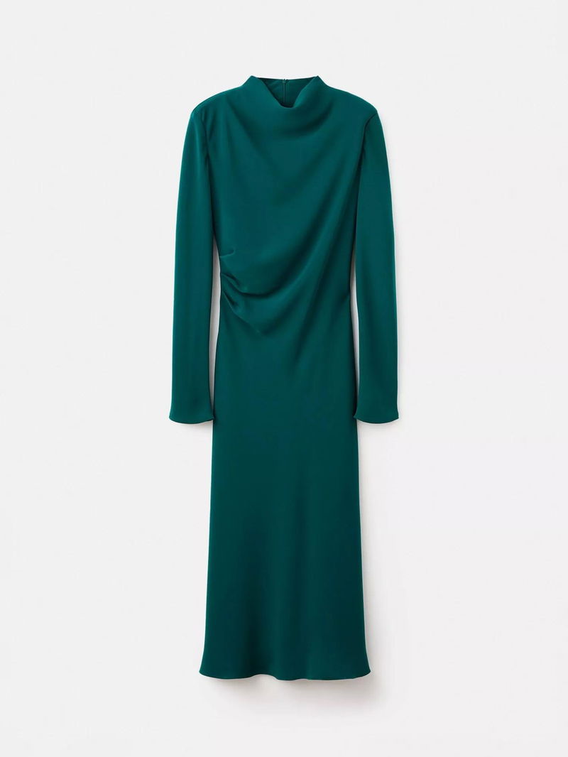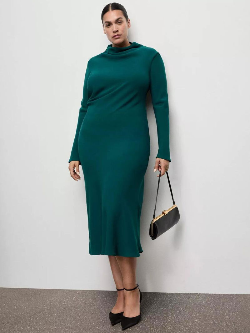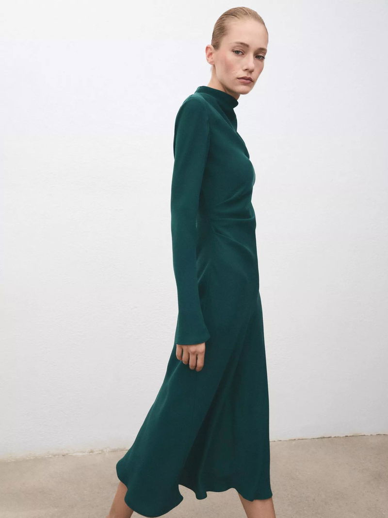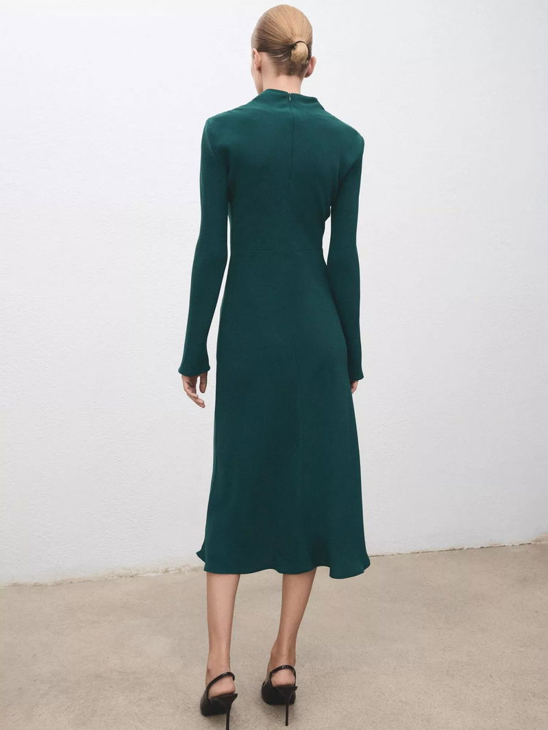 This midi dress features a flattering A-line fit, ruched details, and a high neck. Its long sleeves and full lining make it ideal for all-day wear, helping you feel comfortable and confident.