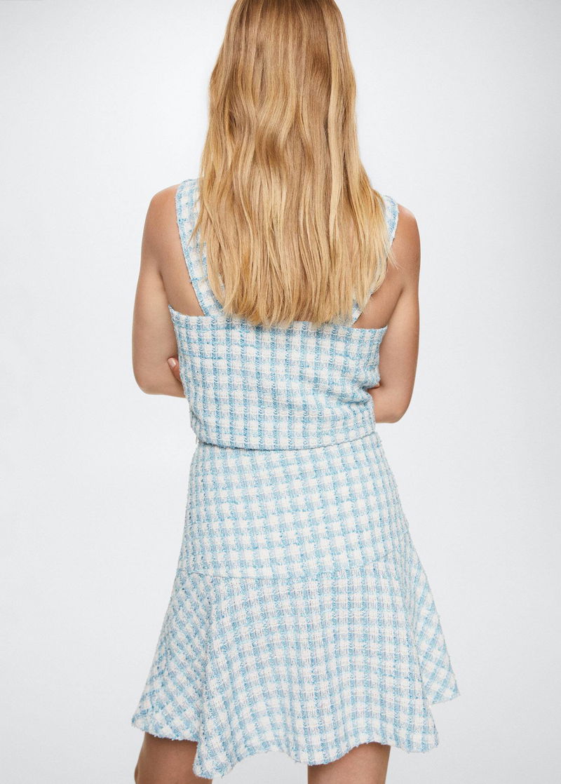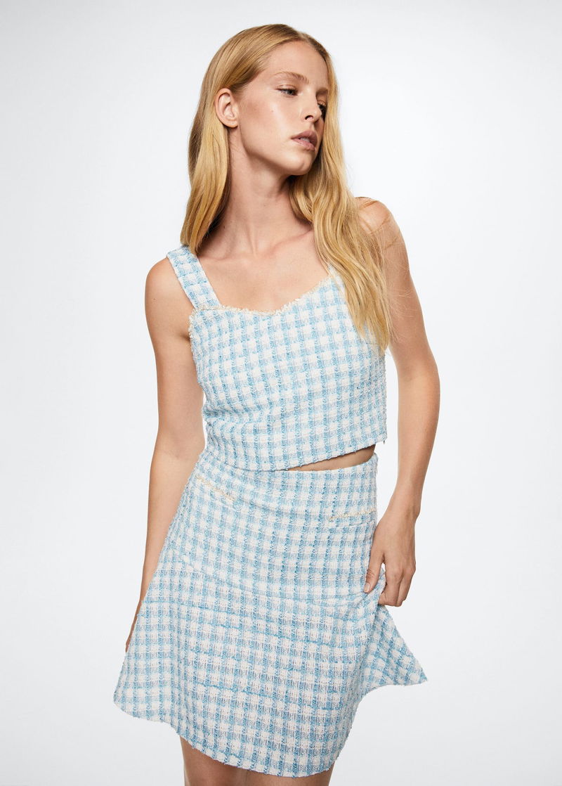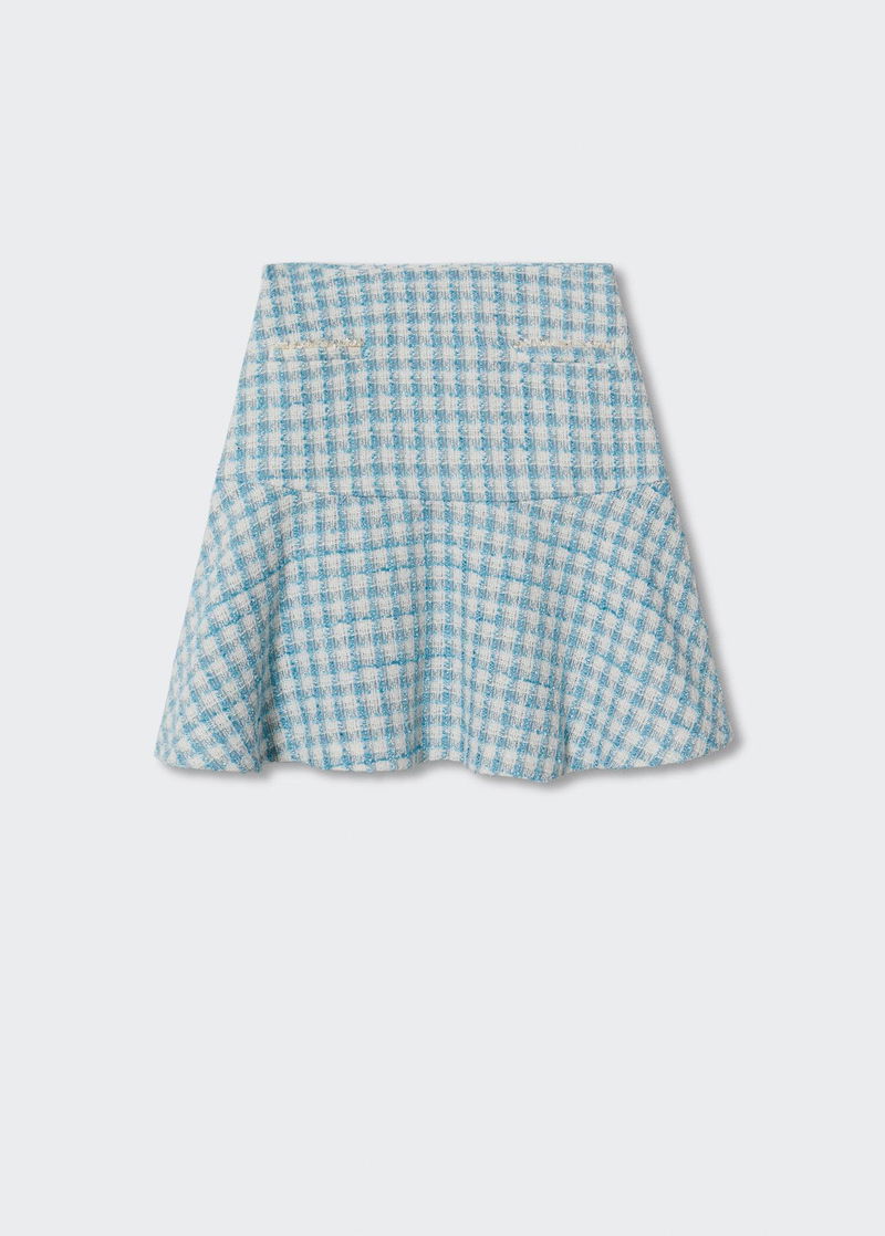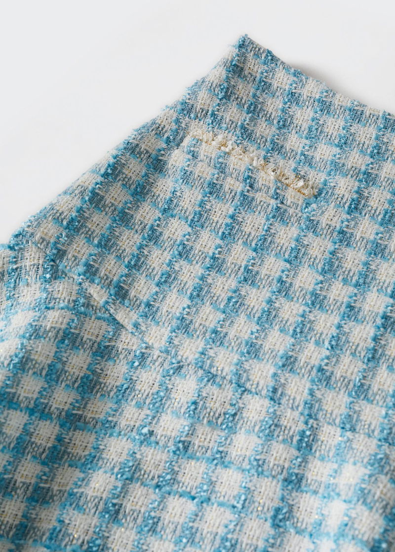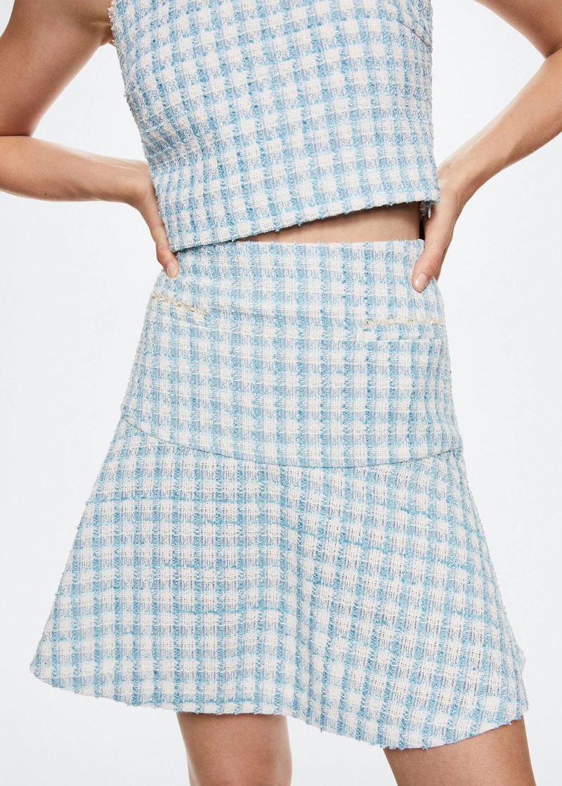Tweed fabric, Checked print, Evasé design, Short design, Invisible lateral zip fastening, Decorative trim, Co-ord.