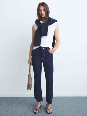 100% Cotton, Combined design, Straight design, Cropped design, Five pockets, Frayed hem, Zip and one button fastening.
