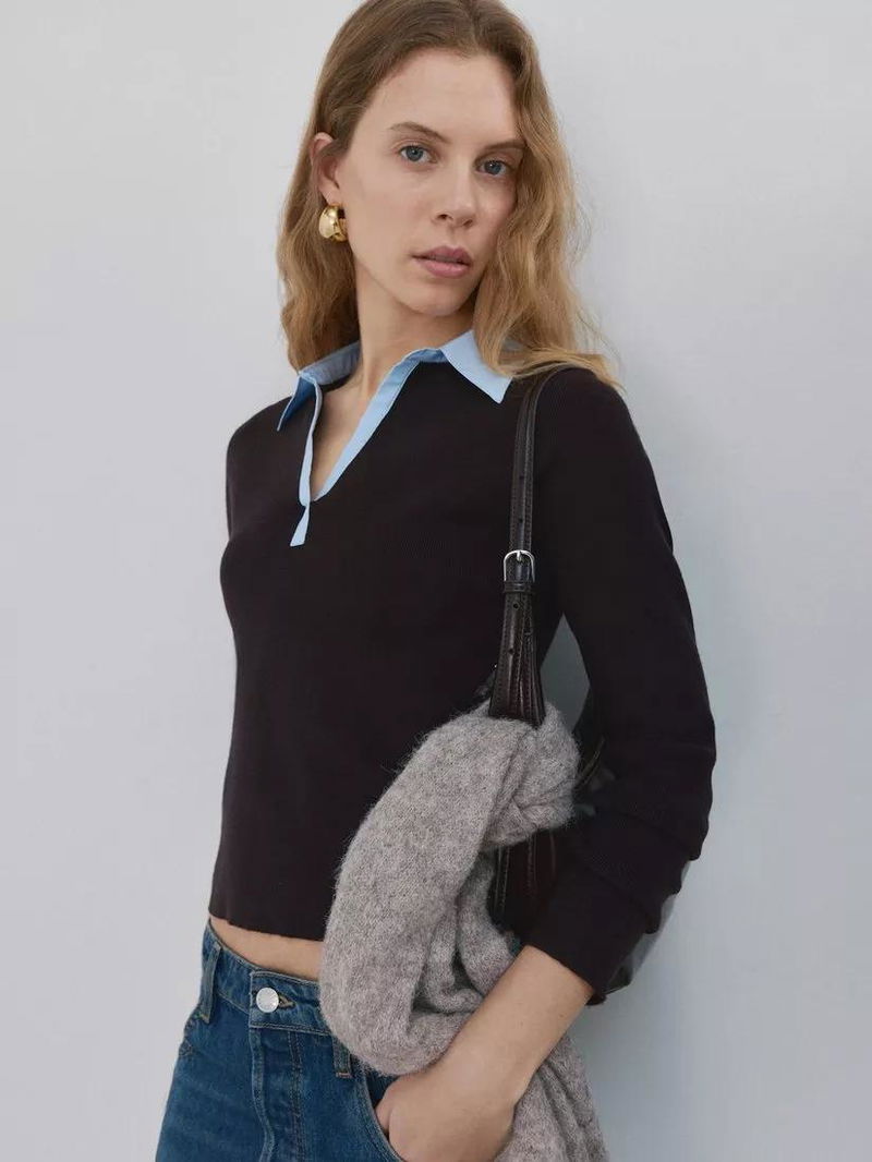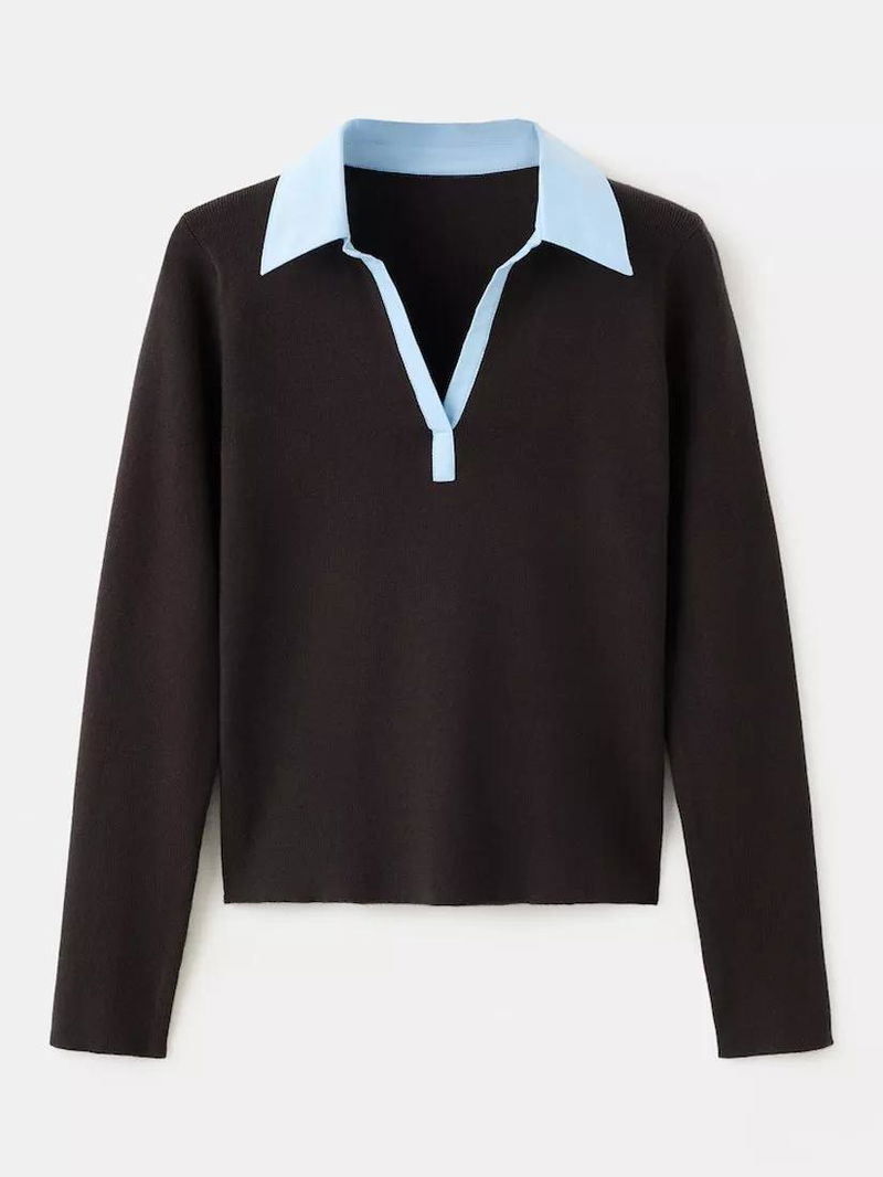 Contrast Collar Long Sleeve Polo Knit Top, Chocolate