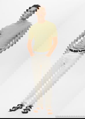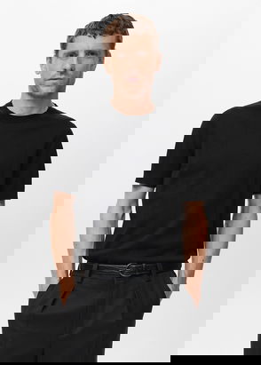 Cotton-blend fabric, Fine knit fabric, Rounded neck, Short sleeve, Cable knit finish.