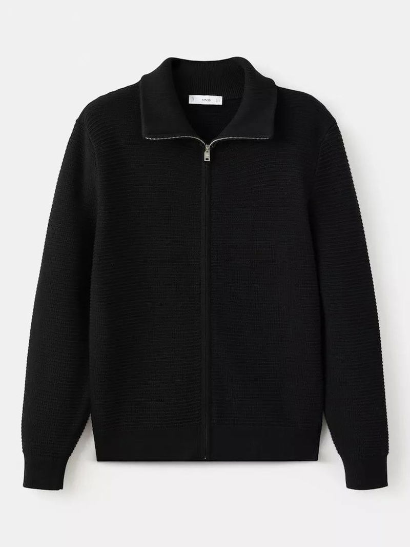 Cotton Knit Collar Zip-Through Cardigan, Black