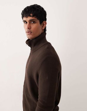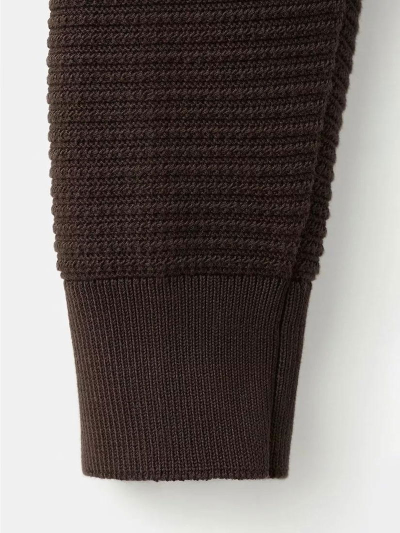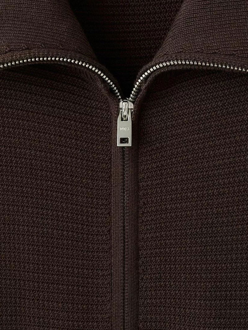 Cotton Knit Collar Zip-Through Cardigan, Chocolate