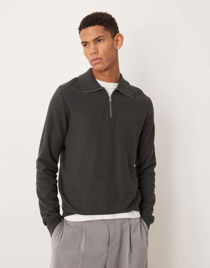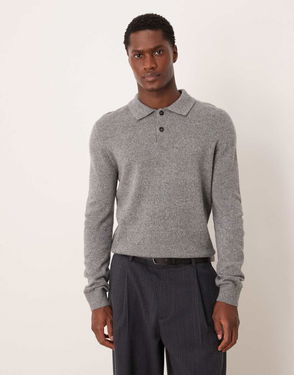 Cotton Mix Long Sleeve Knitted Polo Top In Grey