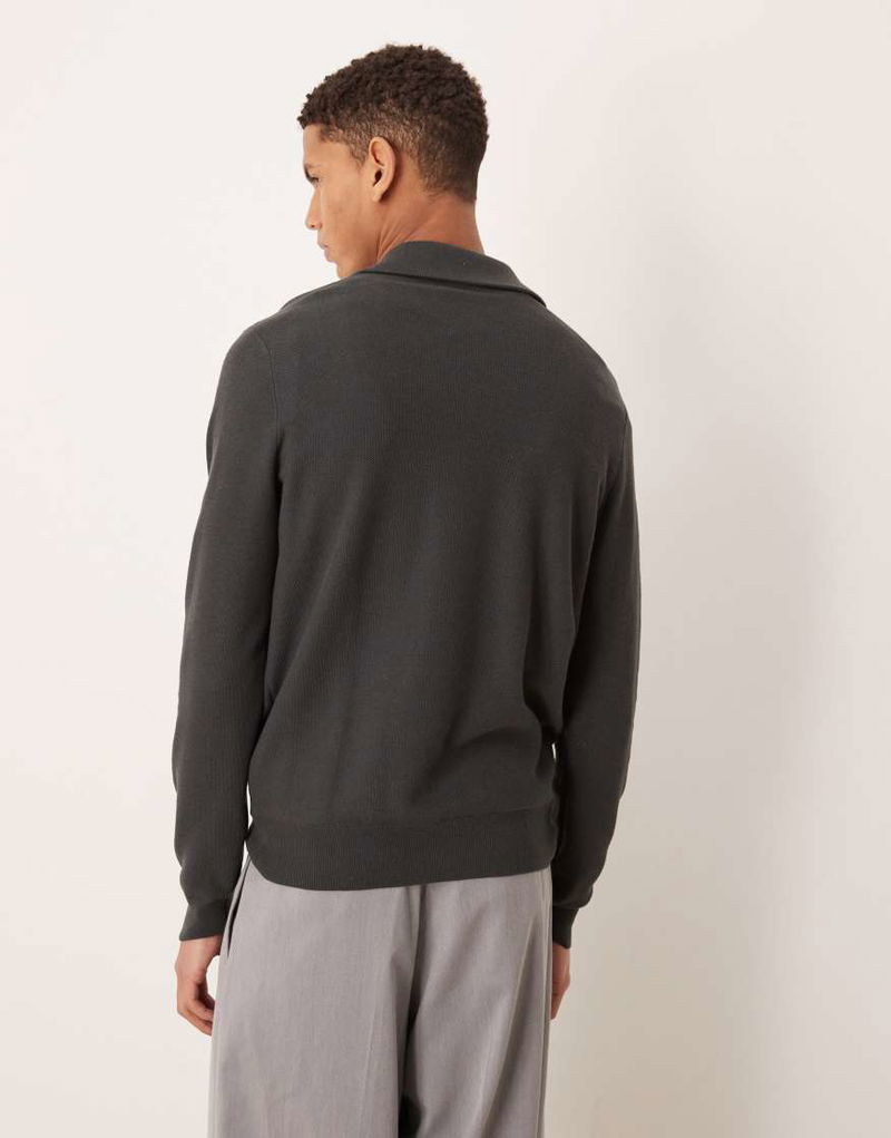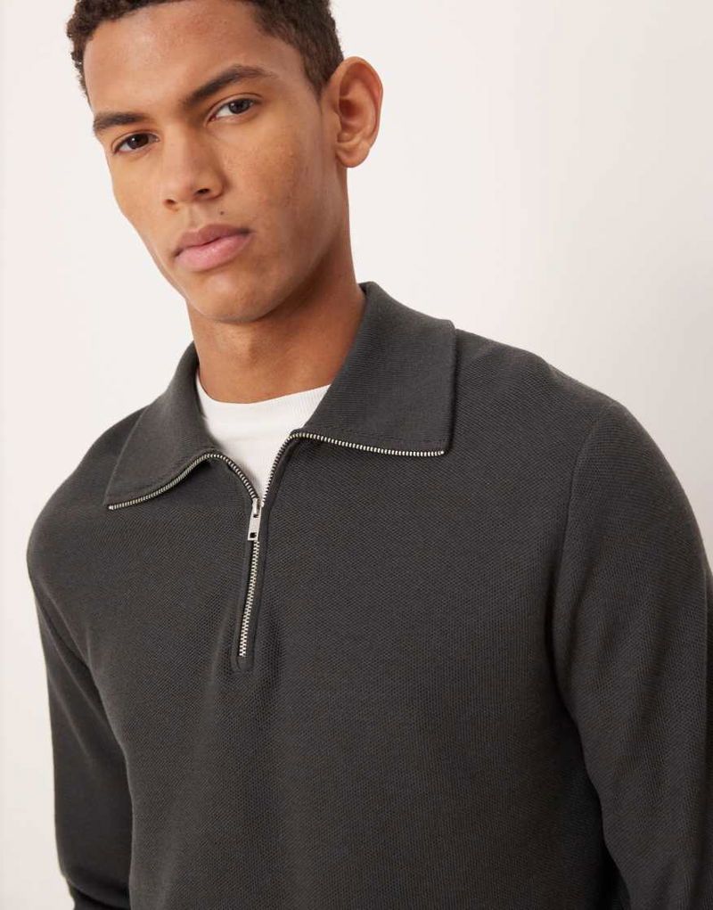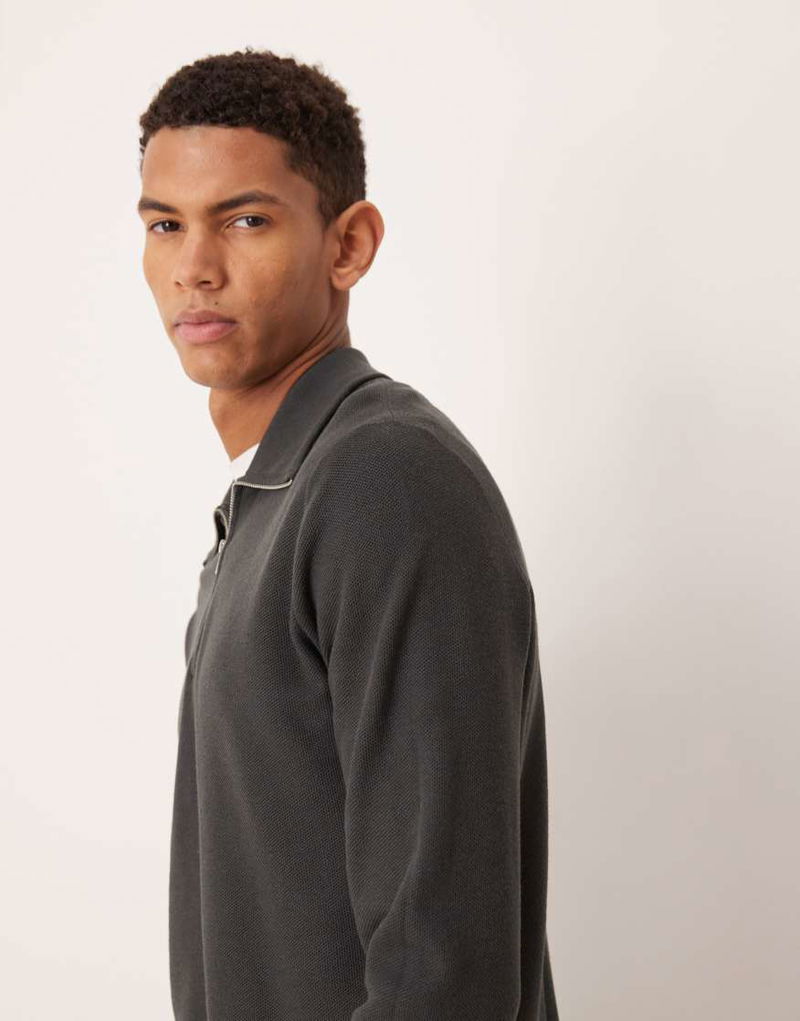 Cotton Mix Quarter Zip Knitted Polo Top In Charcoal