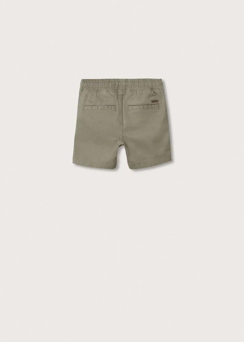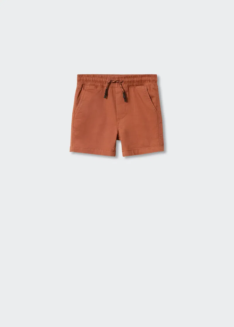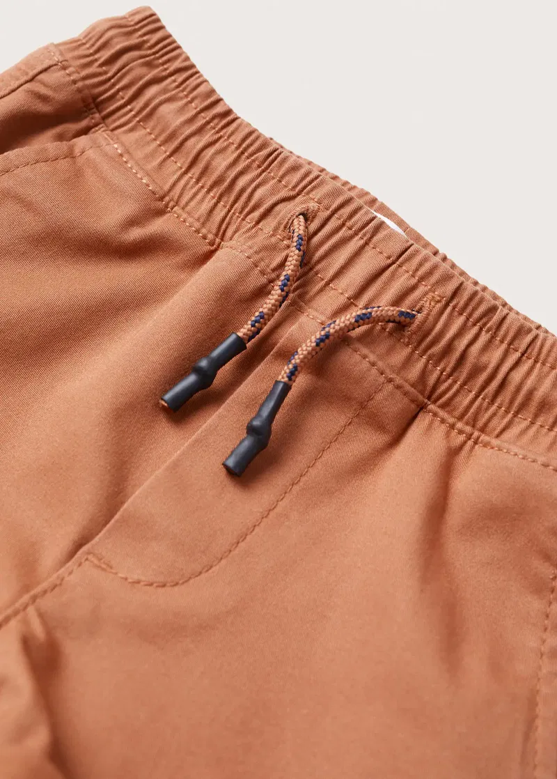 100% cotton fabric, Straight design, Short design, Elastic waist with adjustable drawstring, Contrast lace-up, Two side pockets, Two welt pockets on the back.