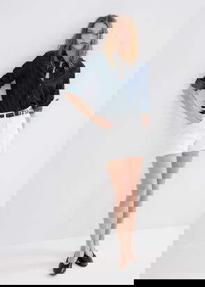 100% Cotton, Combined fabric, Short design, Straight design, Elastic waist with adjustable drawstring, Medium waist, Two side pockets, Message printed on the front.