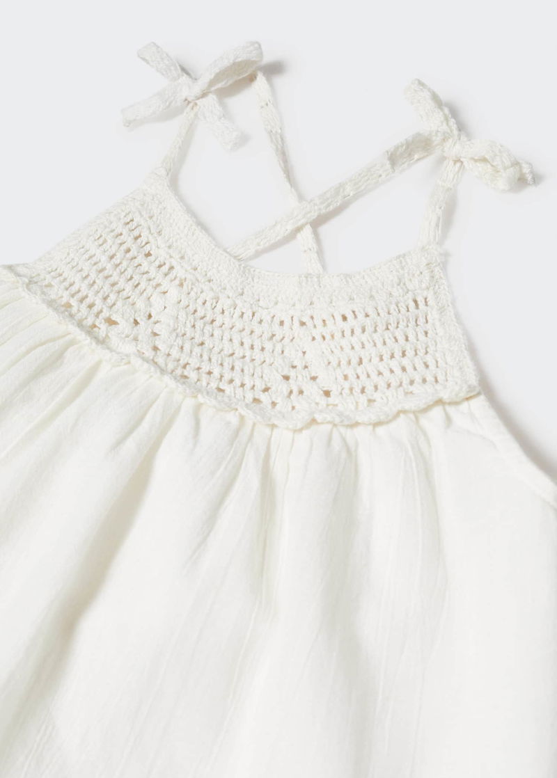 Long design, crochet detail, crossover straps, thin-straps with bow closure, ruffles on the hem, rounded neck, sleeveless.