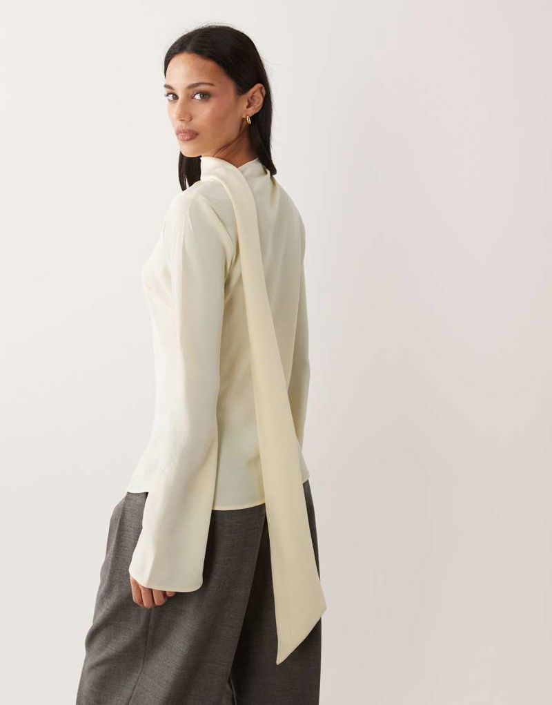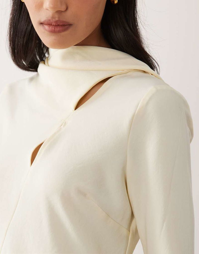 Cut Out Long Sleeve Top With Scarf Detail In Beige