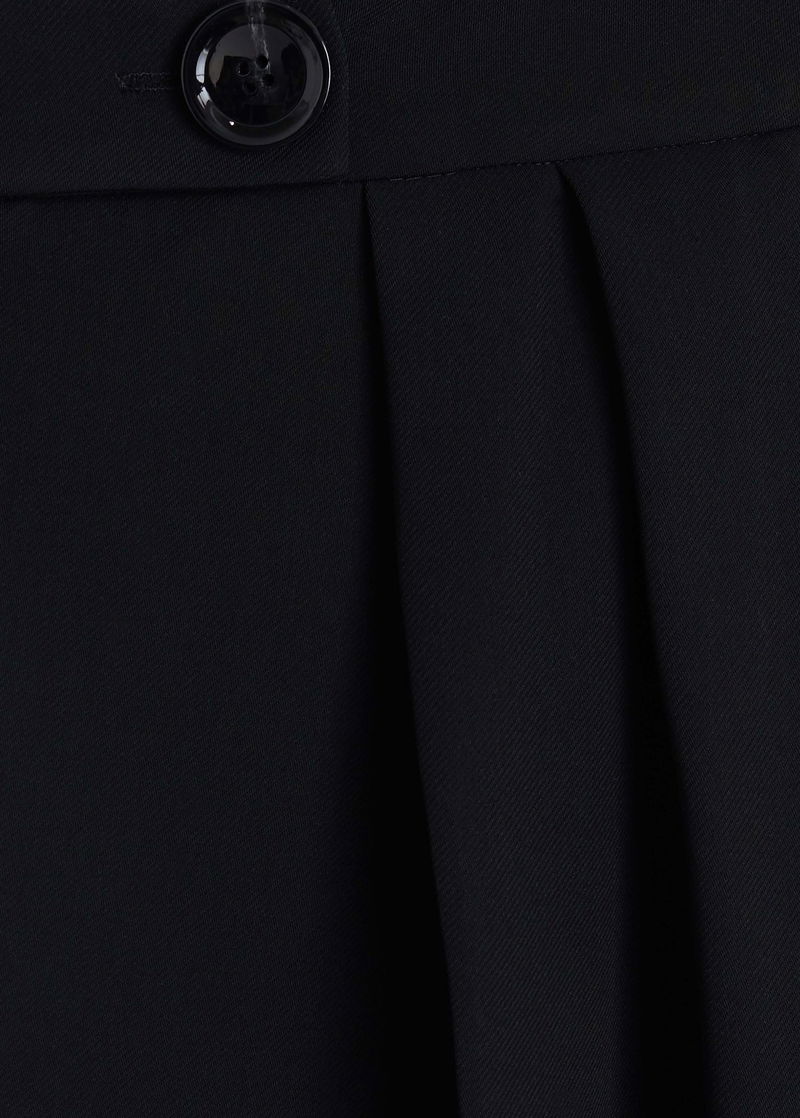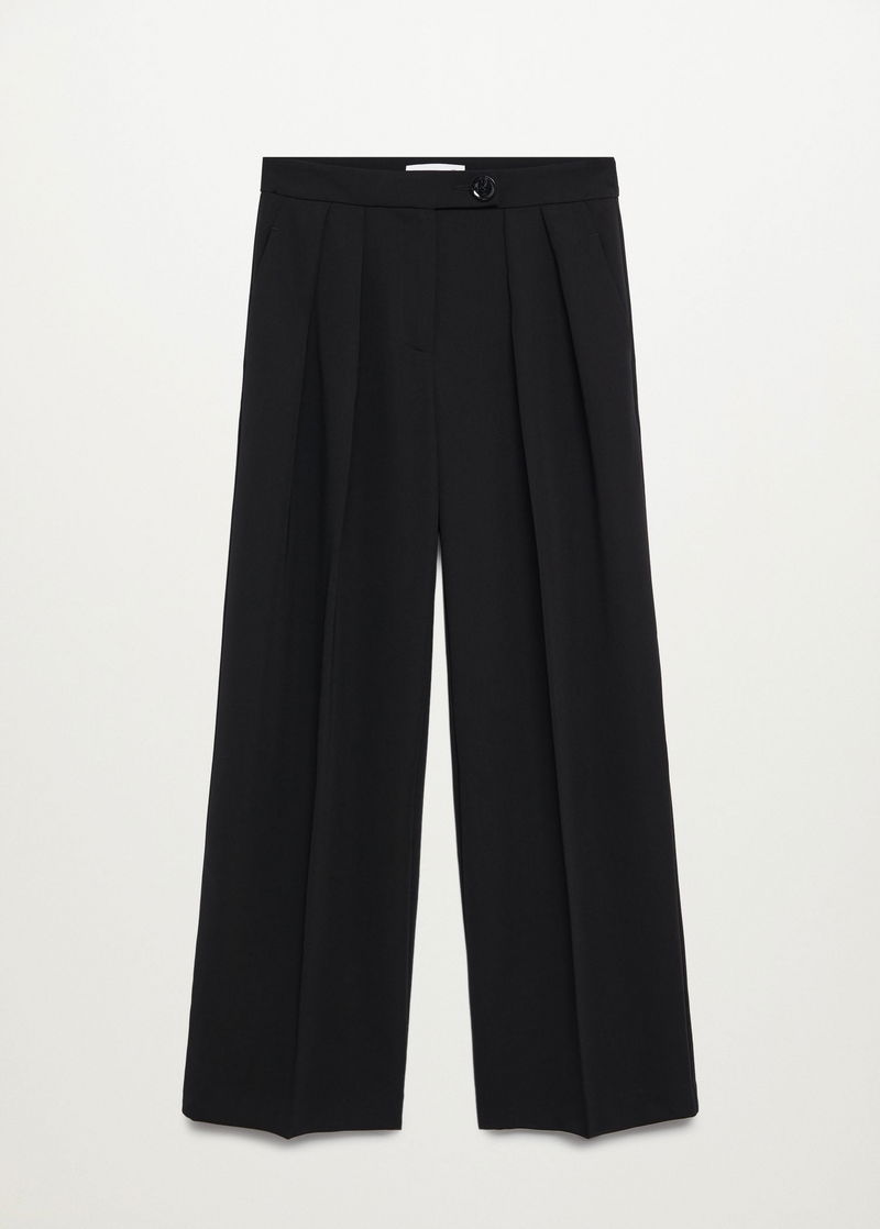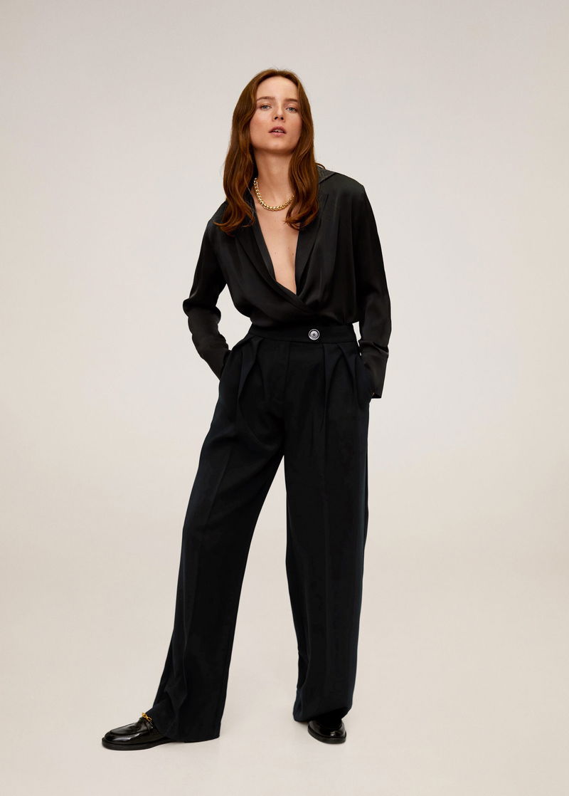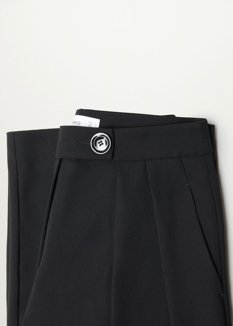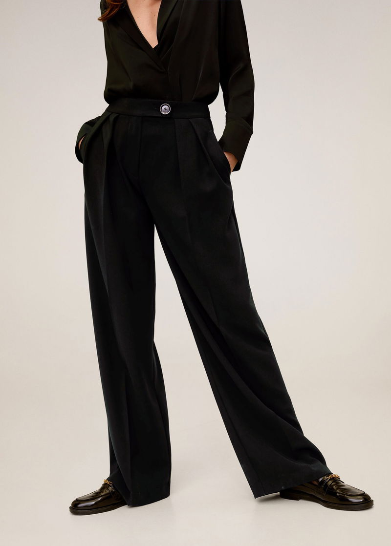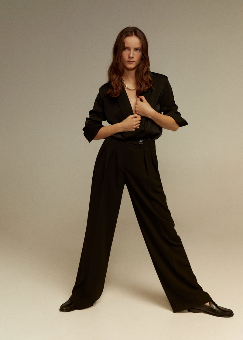 Flowy fabric, Palazzo design, Dart detail, Two side pockets, Welt pocket with button on the back, Zip and one button fastening, Inner lining.