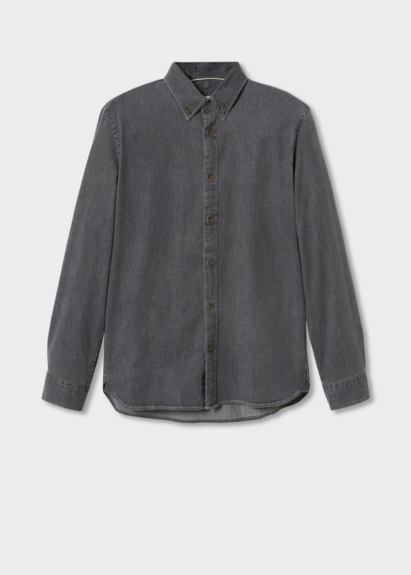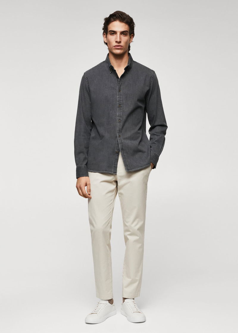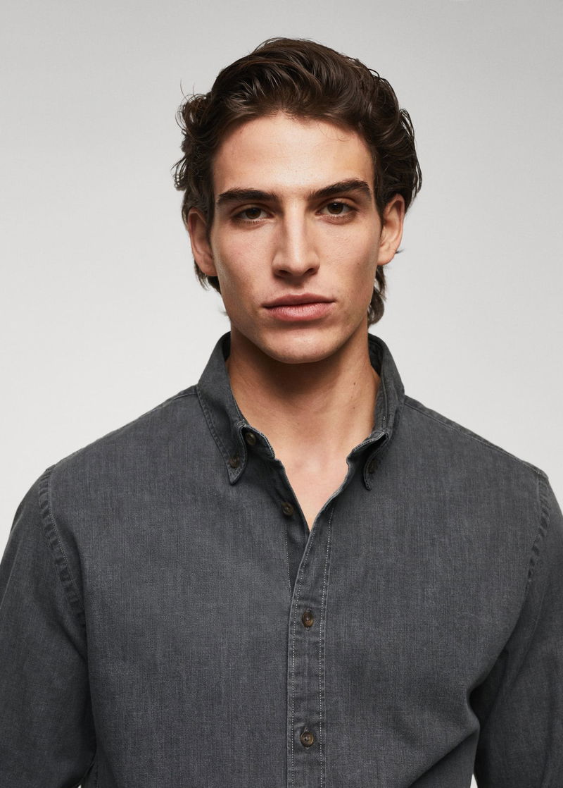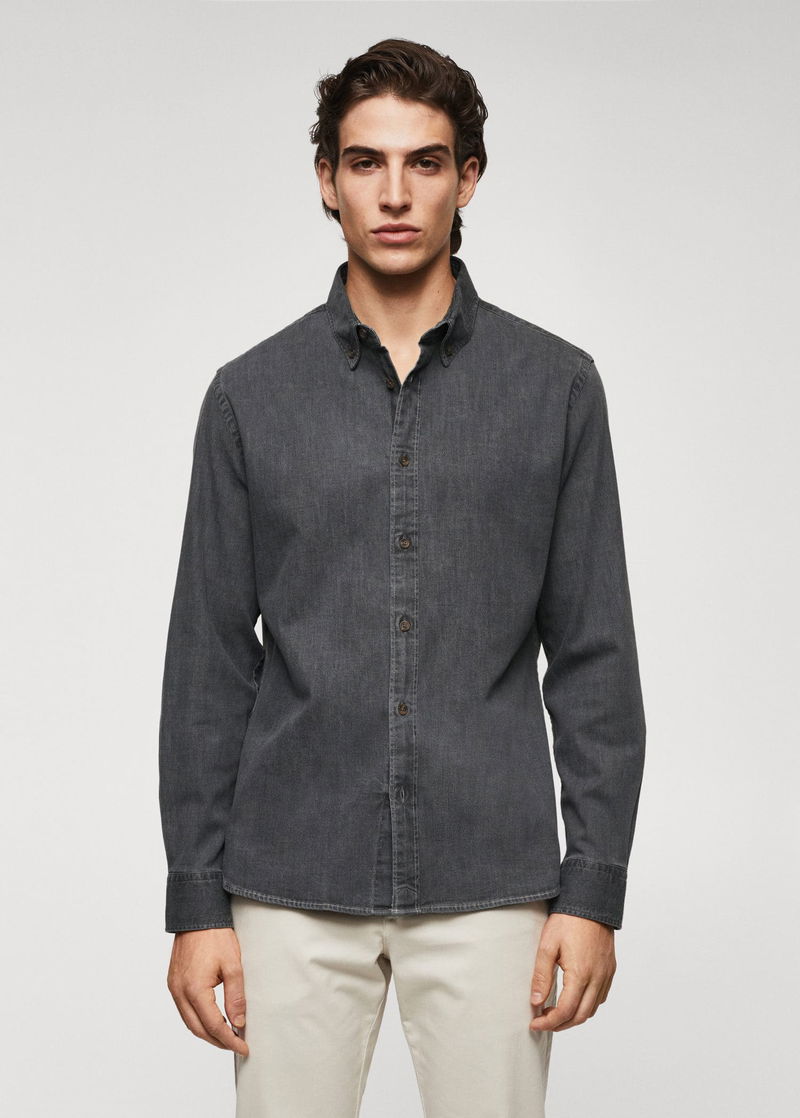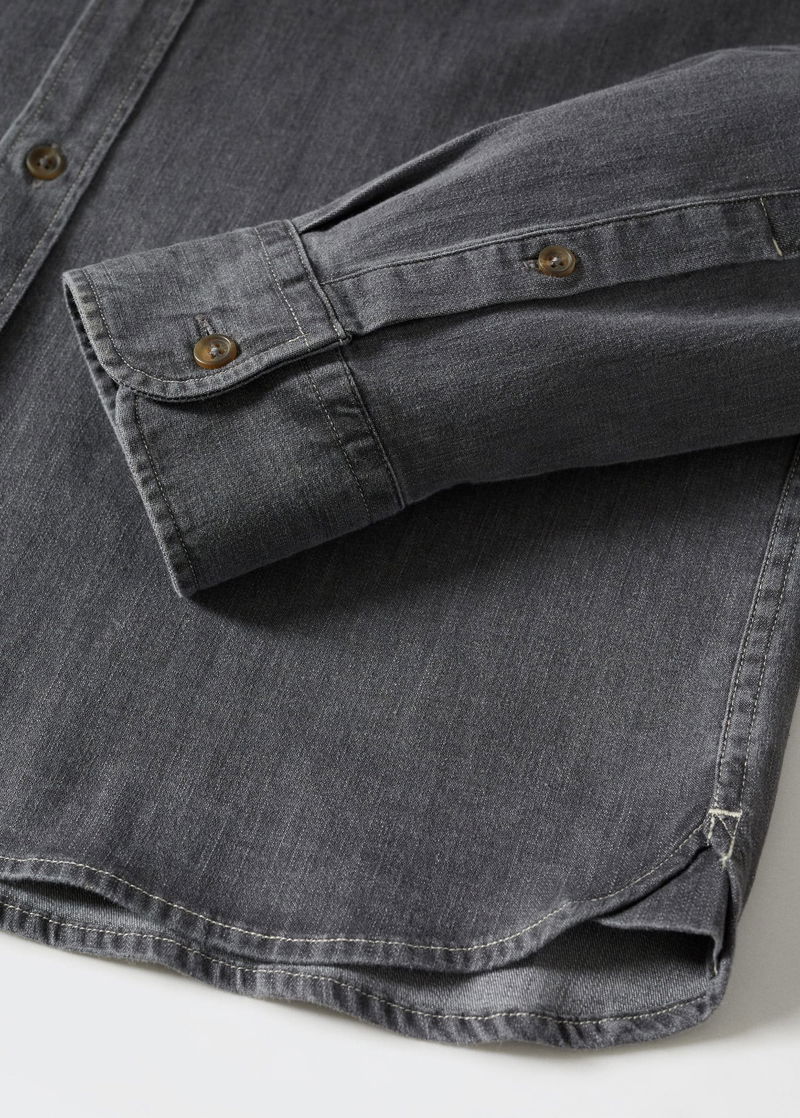 Slim fit, Denim style cotton fabric, Buttoned collar, Long sleeve with buttoned cuffs, Button up.
