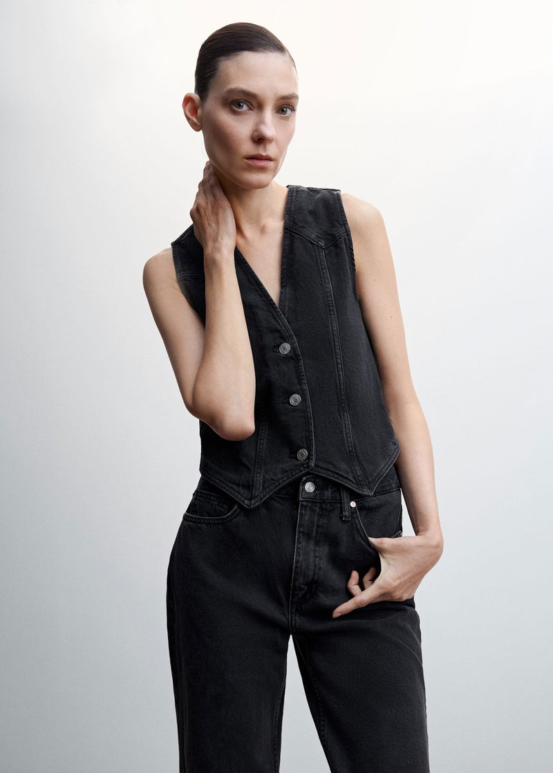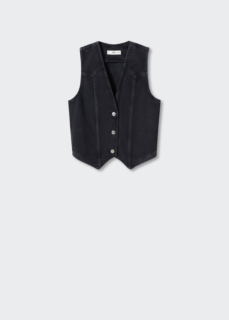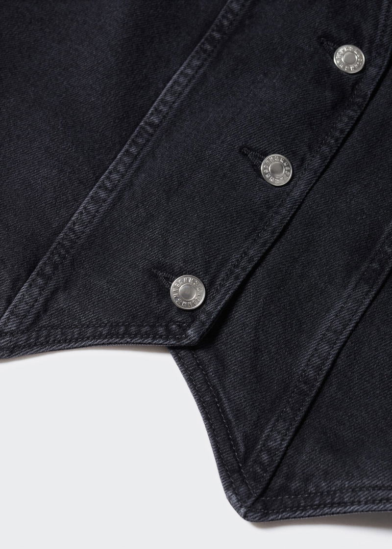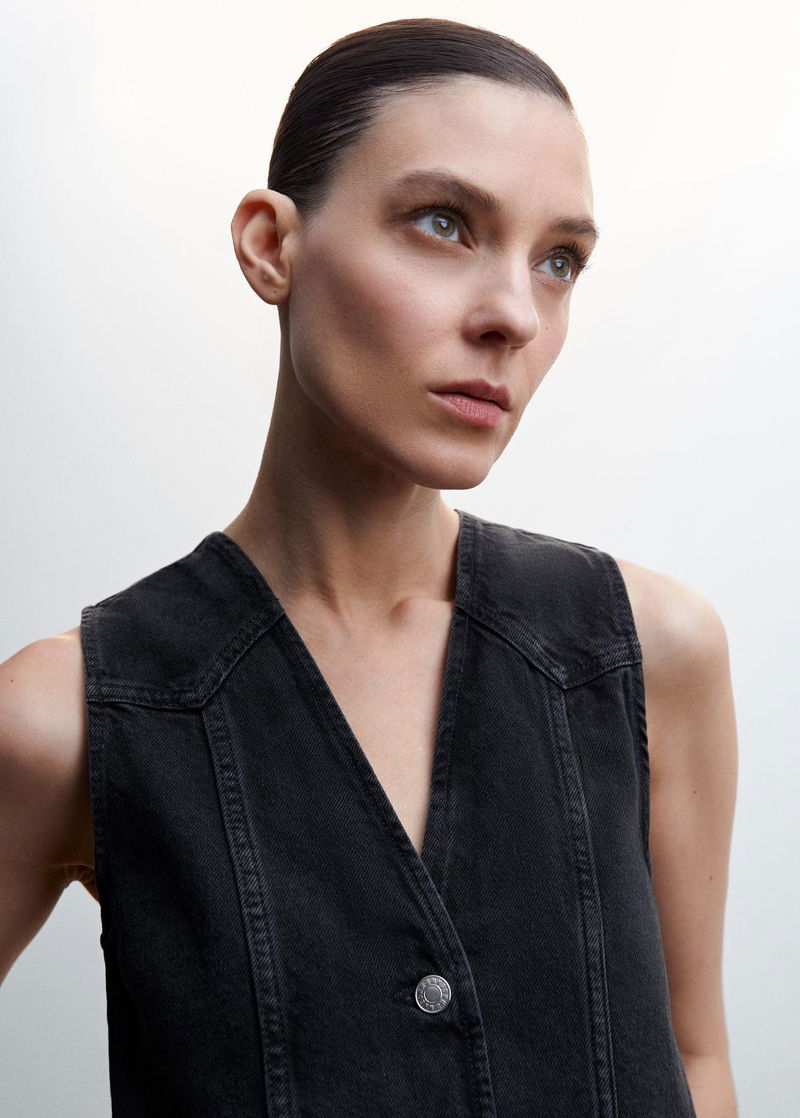 Denim style cotton fabric, Recycled cotton-blend fabric, Short design, Straight design, V-neck, Sleeveless, Button fastening on the front section, Dart detail, Decorative seams, Co-ord.