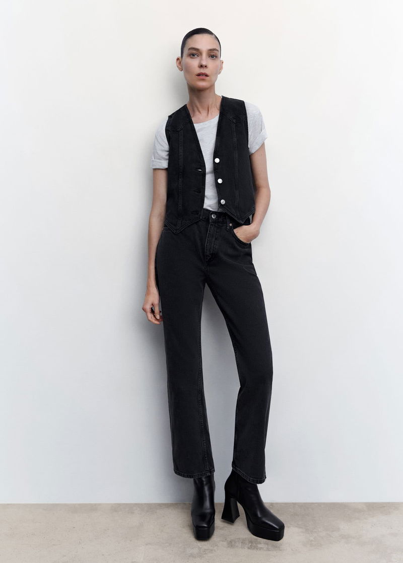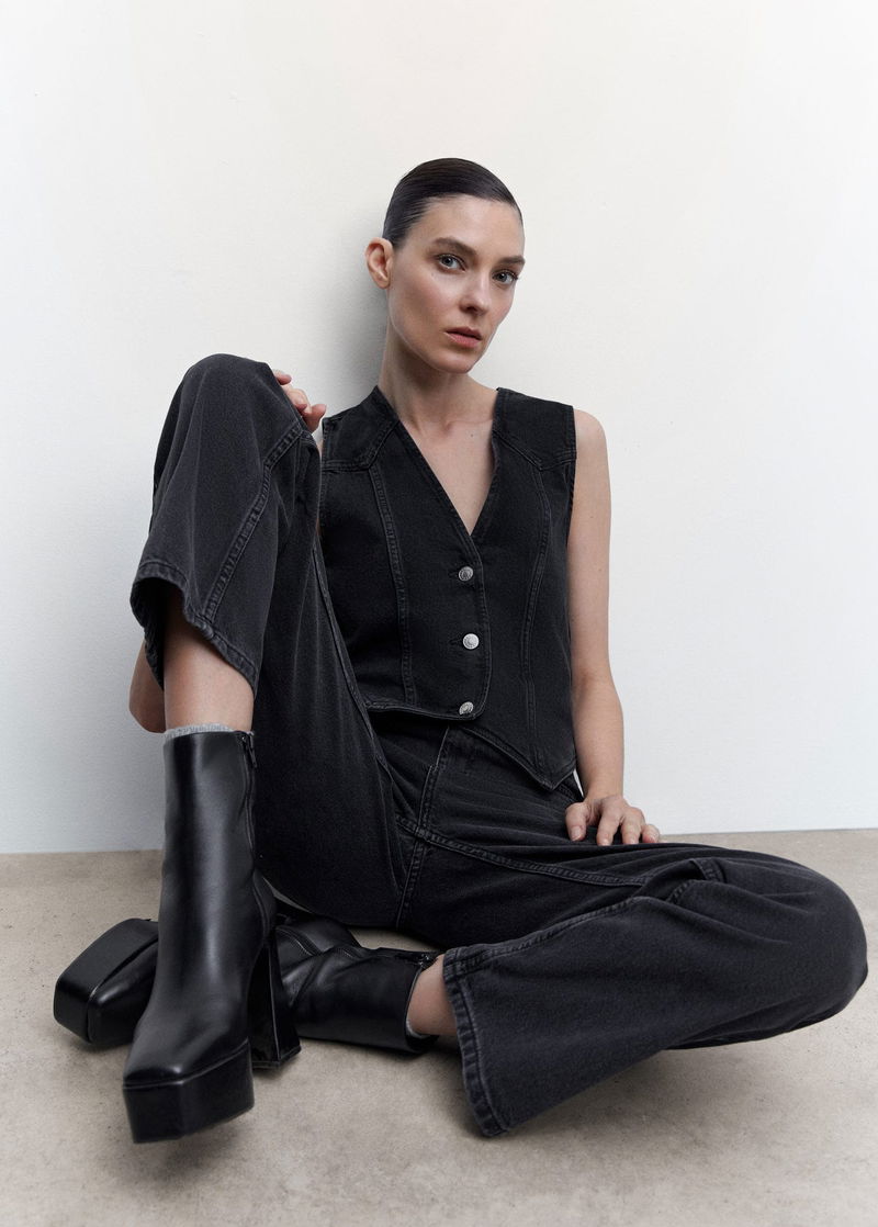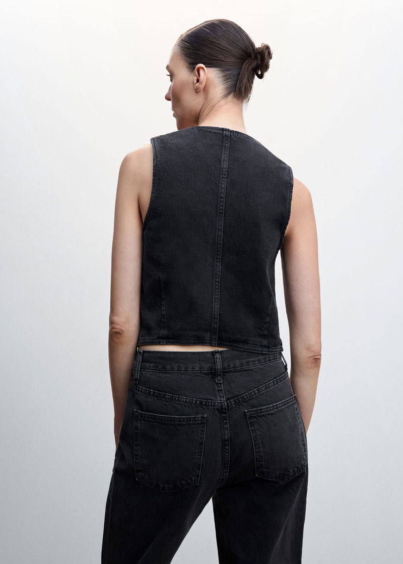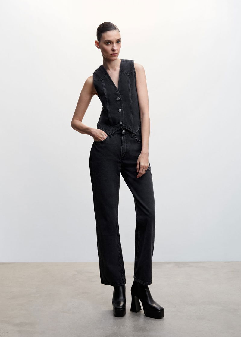 Denim style cotton fabric, Recycled cotton-blend fabric, Short design, Straight design, V-neck, Sleeveless, Button fastening on the front section, Dart detail, Decorative seams, Co-ord.