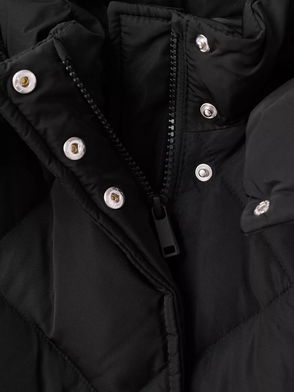Quilted fabric, Long sleeve, Rounded neck, Buttoned pockets on the side, Straight design, Midi design, Hood with synthetic hair detail, Side zip openings, Zipped pocket.