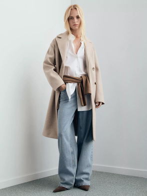 Midi design, Funnel neck, Long sleeve with loops, Two side welt pockets, Double button fastening, Press stud fastening.