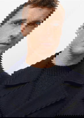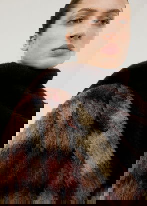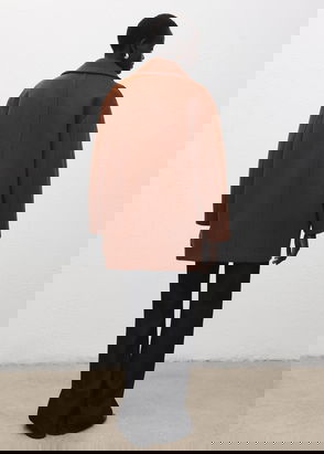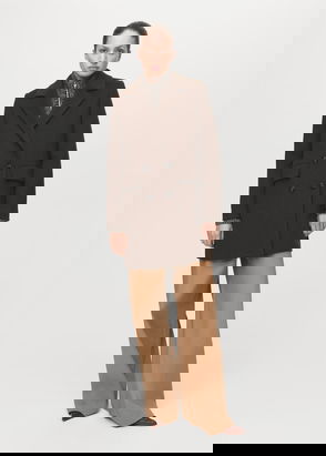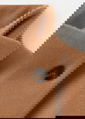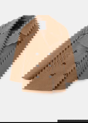 Wool mix fabric, Midi design, Straight design, Crossover design, Peaked lapel, Long sleeve, Two side pockets with flaps, Back slit, Double button fastening, Inner lining.
