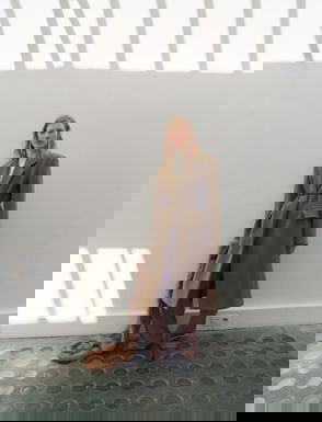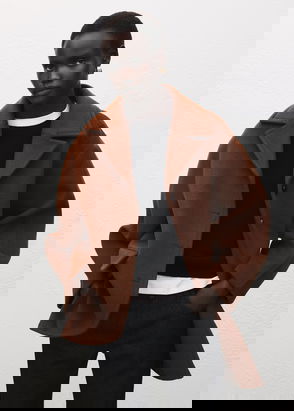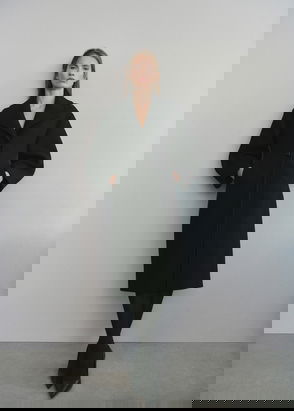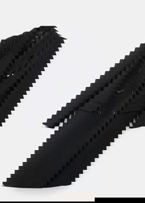 Wool mix fabric, Midi design, Straight design, Crossover design, Peaked lapel, Long sleeve, Two side pockets with flaps, Back slit, Double button fastening, Inner lining.