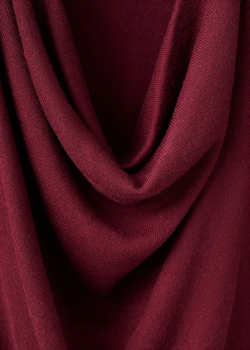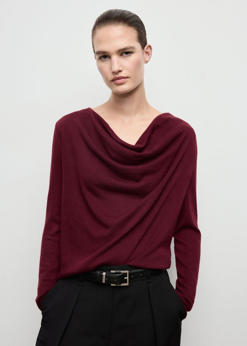 Fine-knit fabric. Straight Design. Draped neckline. Long sleeve.