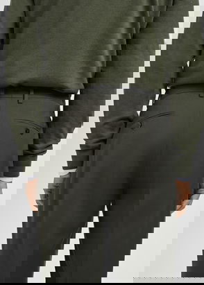 Slim fit, Recycled polyester blend fabric, Elastic waist with adjustable drawstring, Two side pockets, Two welt pockets with button on the back.