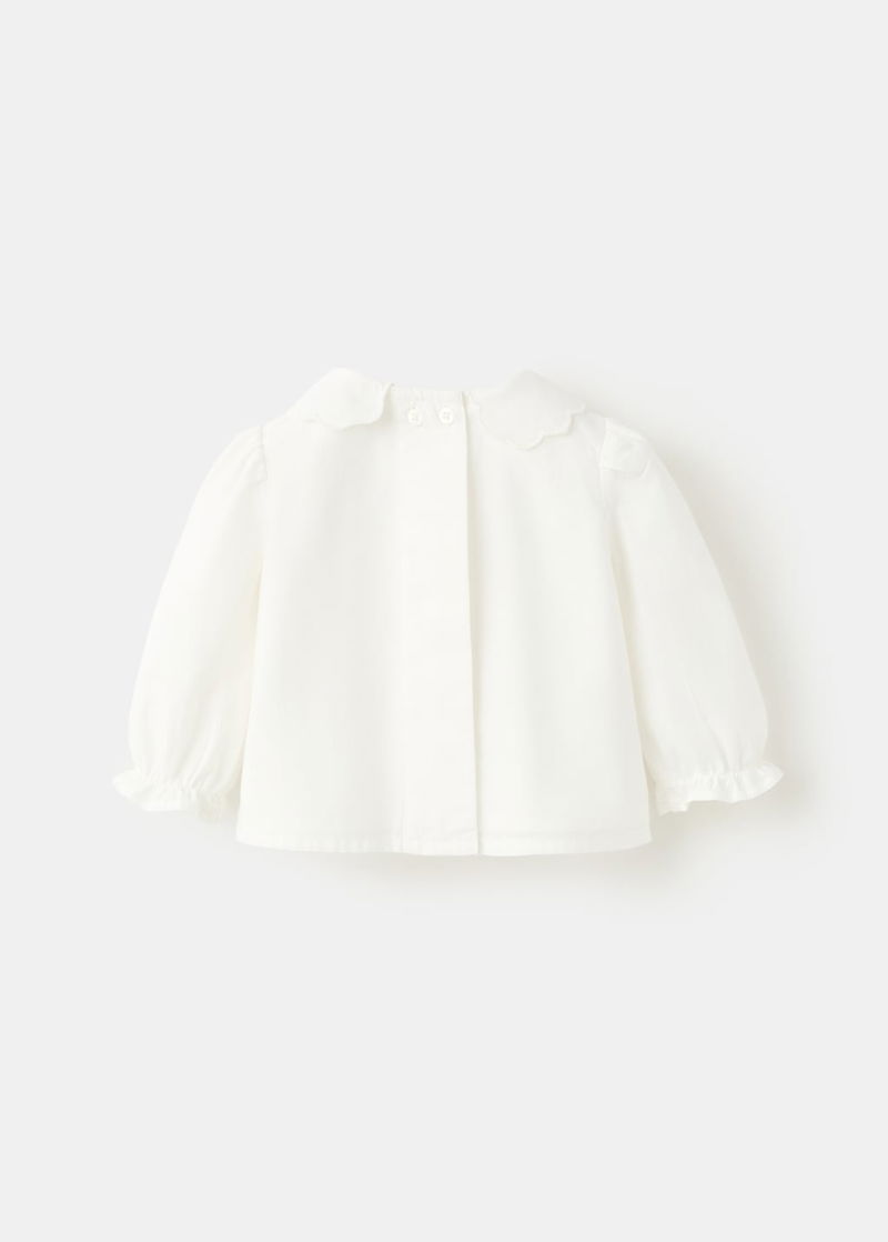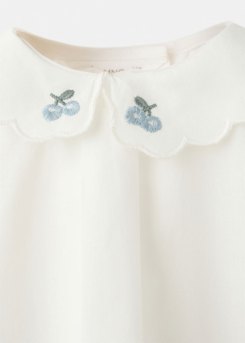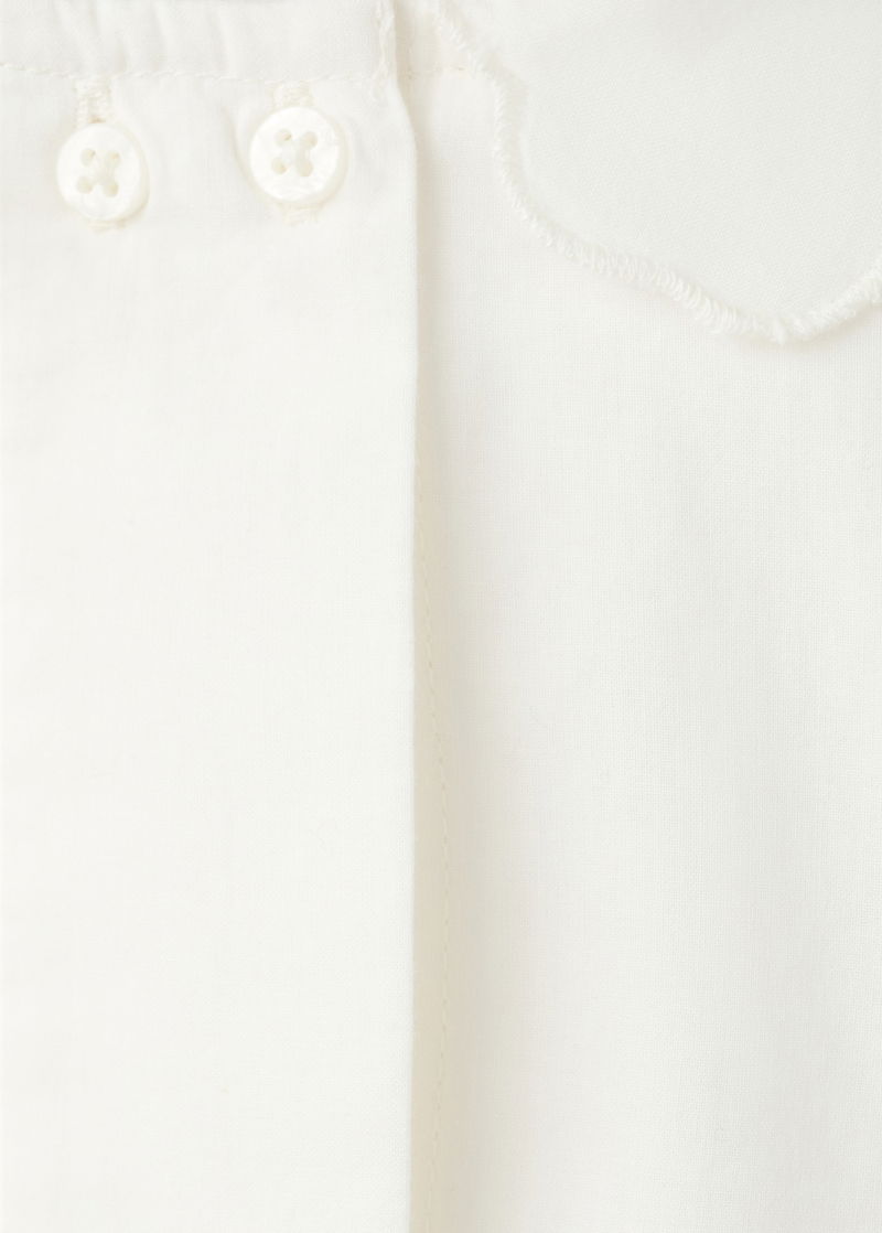 100% cotton fabric. Straight Design. Peter Pan collar. Long sleeves with elastic cuffs. Embroidered details. Scalloped edges. Button fastening on the back section.