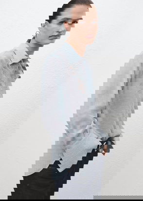 Cotton fabric, Rounded neck, Long sleeve, Decorative embroidery, Gathered detail, Button fastening at back.