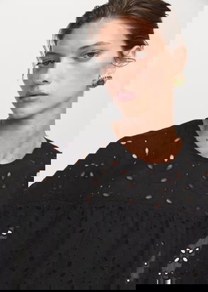 100% Cotton, Straight design, Baby doll neck, V-neck, Embroidery Neck Detail, Puffed three quarter sleeves, Button fastening on the front section.