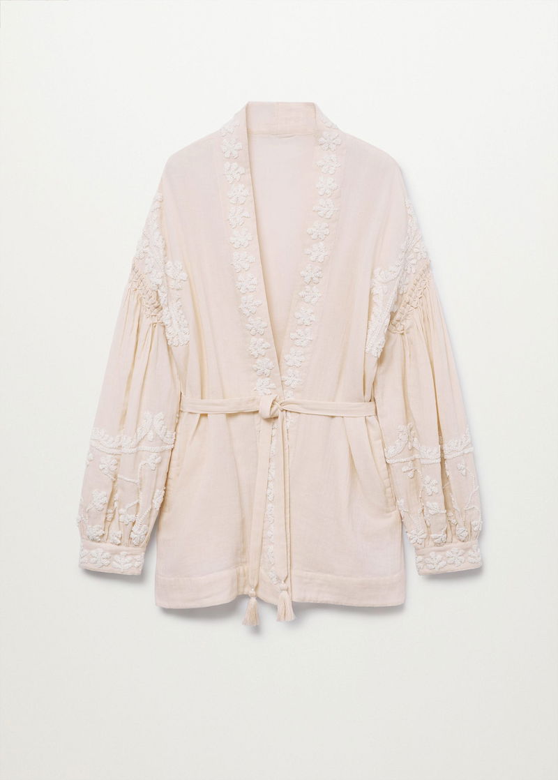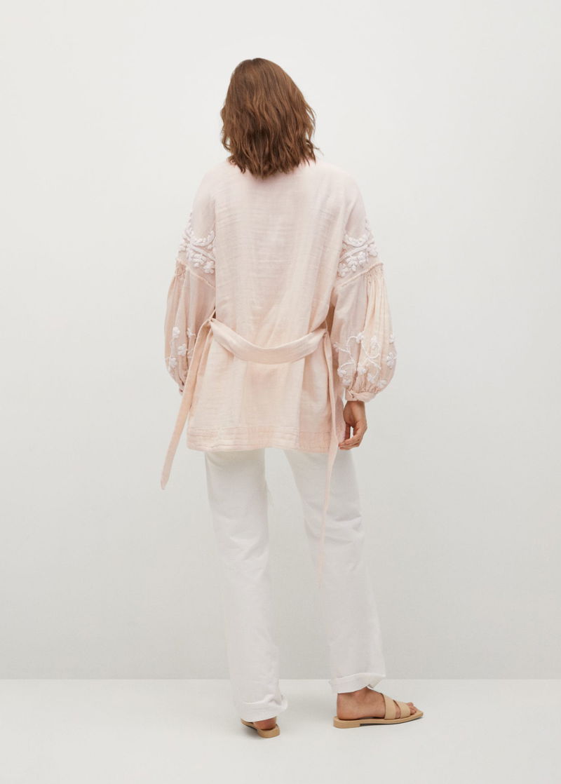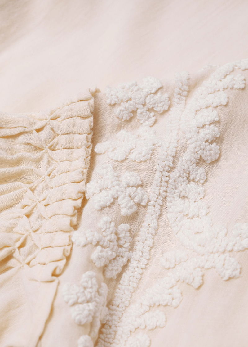 Committed Collection, 100% Cotton, Straight design, V-neck, Long puffed sleeves, Dropped shoulder seams, Two front pockets, Ribbon on the waist with tie closure, Embroidered details.