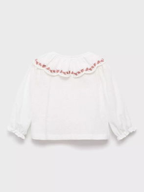 Embroidered details, Pleated details, Rounded neck, Short sleeve, Ruffled short sleeve.