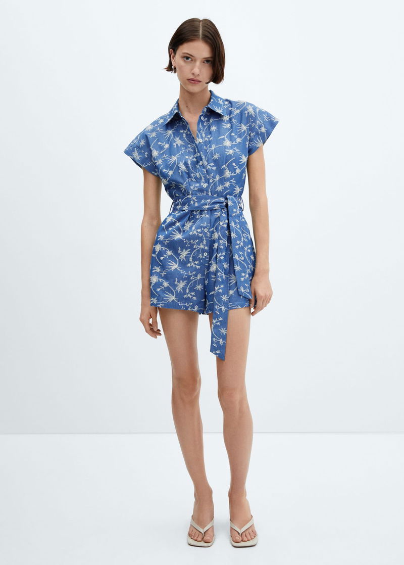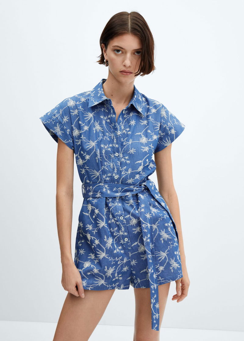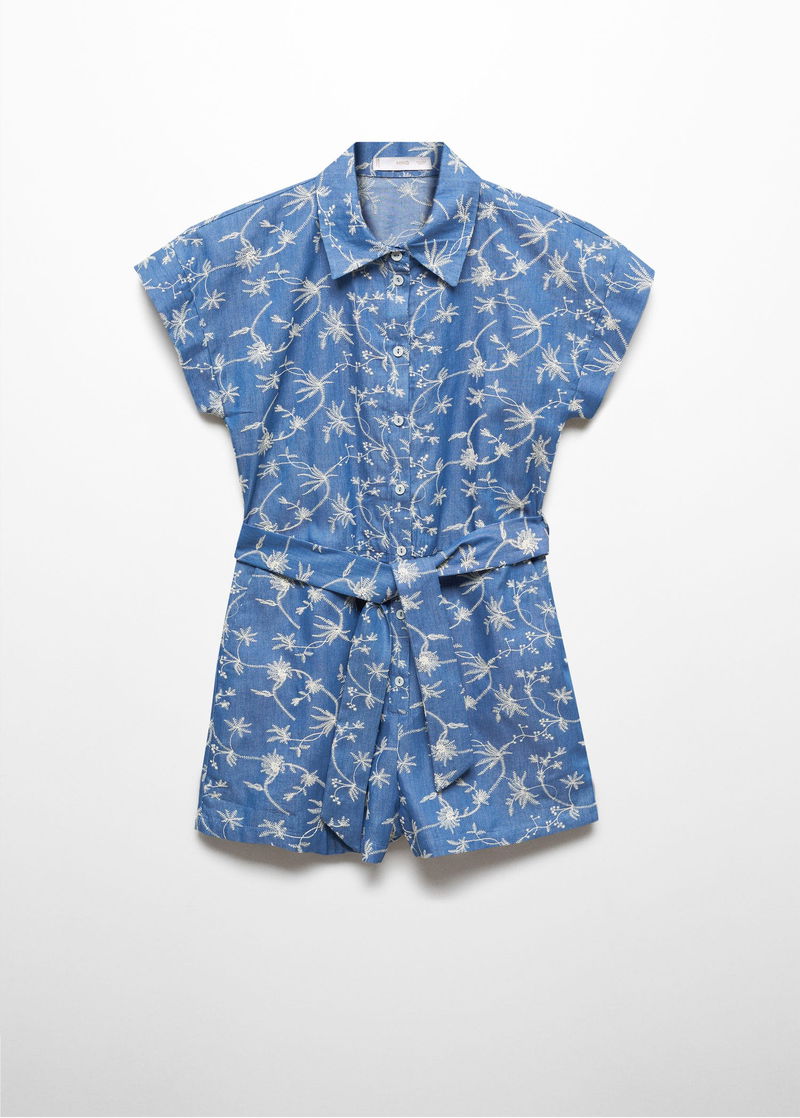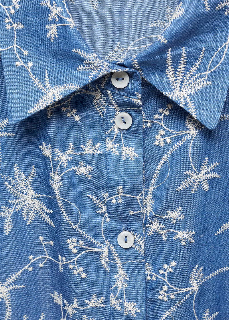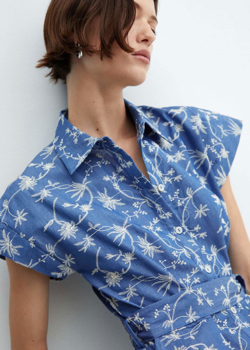 Cotton-blend fabric, Short design, Flowered embroidery, Shirt-style collar, Short sleeve, Two side pockets, Front button closure, Ribbon on the waist with tie closure.